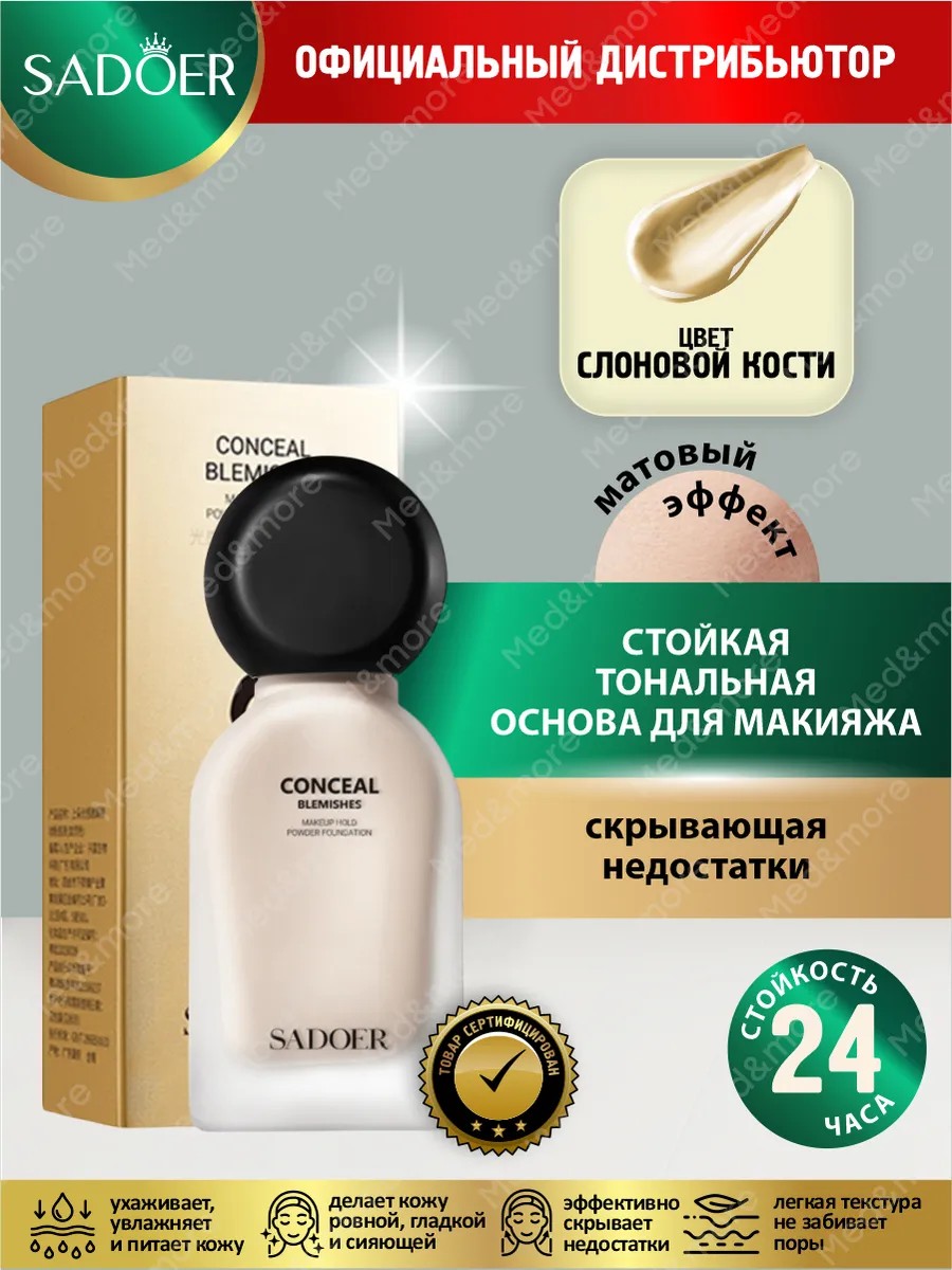 | Комплектация | Стойкая тональная основа для макияжа скрывающая недостатки Sadoer тон Слоновая кость 50 мл. |
