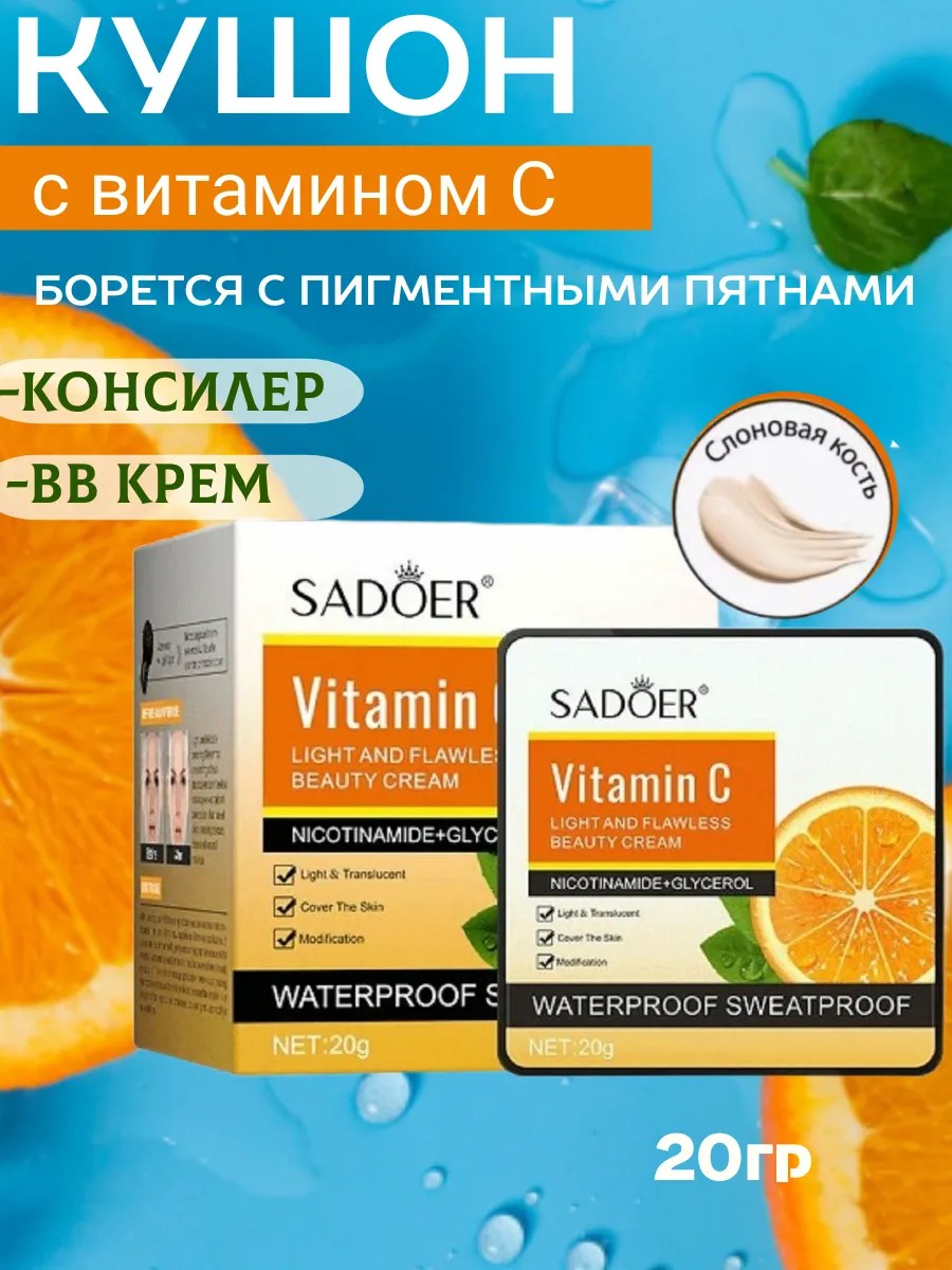 Тональный крем кушон для лица SADOER VITAMIN C ТОН. Средство 02# (ЦВЕТ СЛОНОВОЙ КОСТИ) -это единственное косметическое тональное средство, которое объединяет свойства тонального крема, пудры и BB-крема.В кушоне содержатся ухаживающие и увлажняющие компоненты — это значит, что он способен заменить и дневное увлажняющее средство. Кушон BB-крем идеально выравнивает тон кожи, перекрывает тёмные круги под глазами, покраснения на лице, пигментацию и другие несовершенства. Компоненты крема не только маскируют недостатки, но и ухаживают за кожей: питают и смягчают ее, поддерживают оптимальный уровень увлажненности в течении всего дня и контролируют работу сальных желез, предотвращая появление жирного блеска. Кушон-крем для лица содержит витамин C который, стимулирует выработку коллагена в дерме.Увлажняющий крем-кушон для лица борется со всеми проявлениями фотостарения, утолщением и неровностью кожи, пигментными пятнами. Крем для лица с пудрой угнетает выработку эумеланина, что способствует осветлению кожи и возвращению ей сияния. Противовоспалительные свойства крема для лица позволяют использовать его для заживления ран. Отличная косметическая основа, база под макияж с мягкой шелковистой структурой.