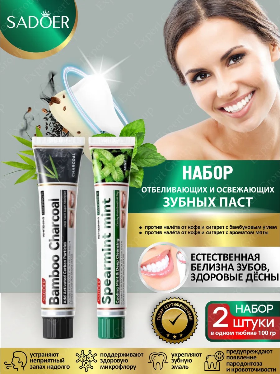 | Полное наименование товара | Набор отбеливающих зубных паст против налета от кофе и сигарет Sadoer с бамбуковым углем + с мятой |