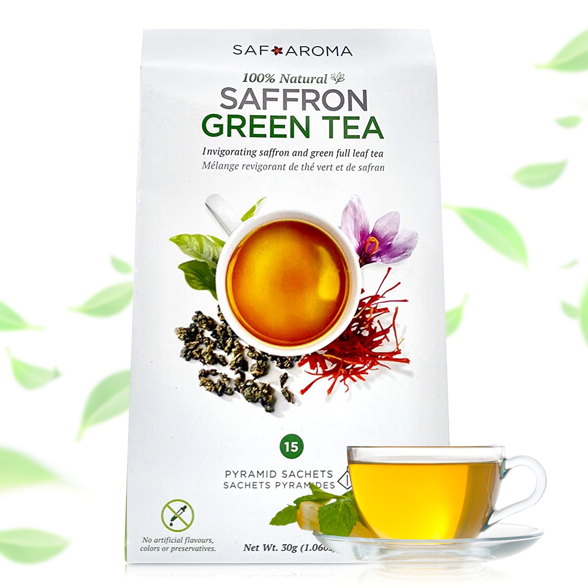 Safaroma Saffron Green Tea - Containing Premium Red Saffron Threads - Certified Organic Full Leafs - Saffron Green Gunpowder Tea -Perfect Detox & Very Tasty Tea |15 Transparent Naturally-Made Sachets