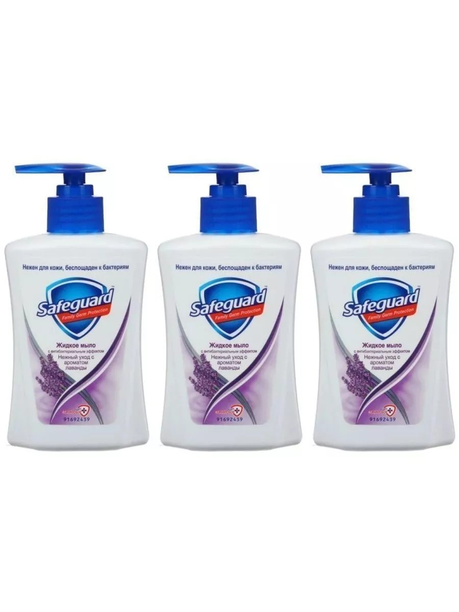 Жидкое мыло Safeguard, 3 шт по 225 мл. SAFEGUARD Жидкое мыло Нежный уход с ароматом Лаванды 225 мл. Окунитесь в атмосферу Прованса и лавандовых полей, согретых летним солнцем, используя жидкое мыло Safeguard (Сейфгард) Нежный уход с ароматом лаванды с антибактериальным эффектом. Формула Щит от микробов смывает грязь и бактерии с рук и обеспечивает антибактериальную защиту от микробов каждый день. Наше жидкое мыло нежно для кожи, беспощадно к бактериям. По данным Всемирной организации здравоохранения, тщательное мытье рук - наиболее эффективный метод предотвращения распространения вирусов. Safeguard, защищаем семьи с 1963 года. СПОСОБ ПРИМЕНЕНИЯ: выдавите порцию мыла на руки, намыльте ладони, обработайте тыльную поверхность, зоны между пальцами и под ногтями, ополосните руки водой и высушите полотенцем. Рекомендуемая продолжительность мытья рук - 40-60 секунд.
