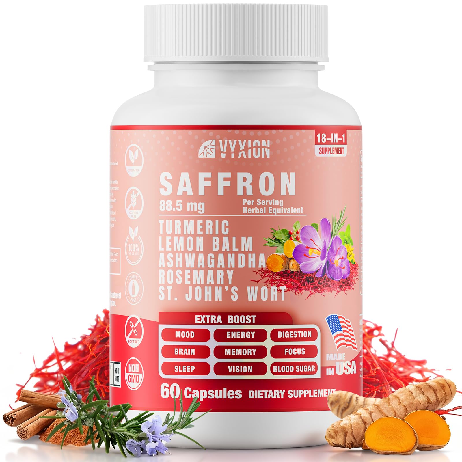 Saffron Supplements Pure Saffron Extract with Turmeric & Ashwagandha 18-in-1 Herbal Mood & Energy Sargol Saffron Extract for Mental Clarity Focus & Stress Support Vegan Non-GMO 60 Capsules