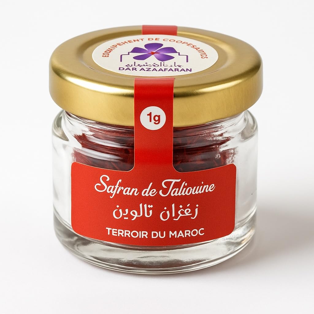 Safran AOP Taliouine 1 g Safran du Maroc Premium Filaments Entiers Grade A R colt la Main Pot en Verre pice Gastronomique Standard