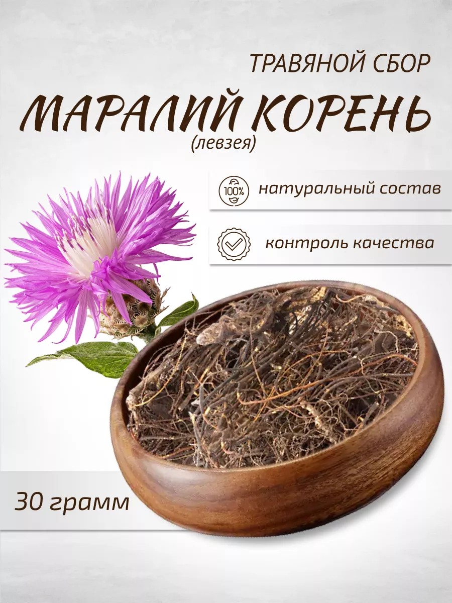 Stimulates and increases performance during mental and physical fatigue. Leuzea has a regulating effect on blood pressure - in case of low blood pressure, its preparations help to raise it to normal and, conversely, in case of slight increase - lower it to normal. Leuzea preparations ensure sufficient blood supply to the central nervous system, are used for depression, and are useful for oncological diseases. Leuzea is also considered useful for diabetes. Method of preparation and use: Decoction: Place 10 grams of maral root in a thermos and pour 250 grams of boiling water, leave for 30 minutes. Take orally 1/3 cup 3 times a day, 30 minutes before meals. Tincture: Pour 500 grams of vodka over 50 grams of safflower leuzea root and leave in a cool, dark place for 10 days. Drink 1 teaspoon 3 times a day before meals.