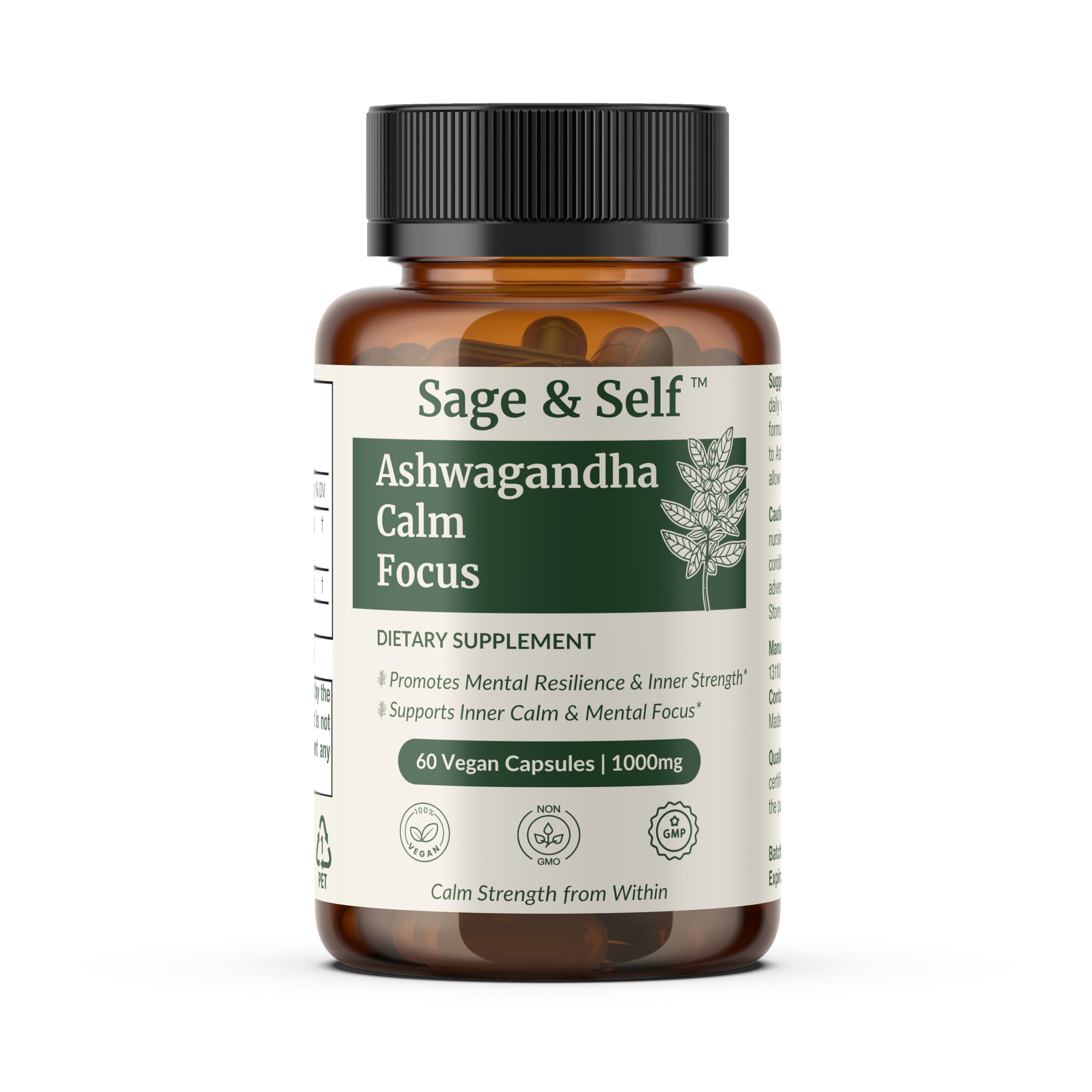 Sage & Self Ashwagandha Calm Focus bottle with botanical background and wellness theme