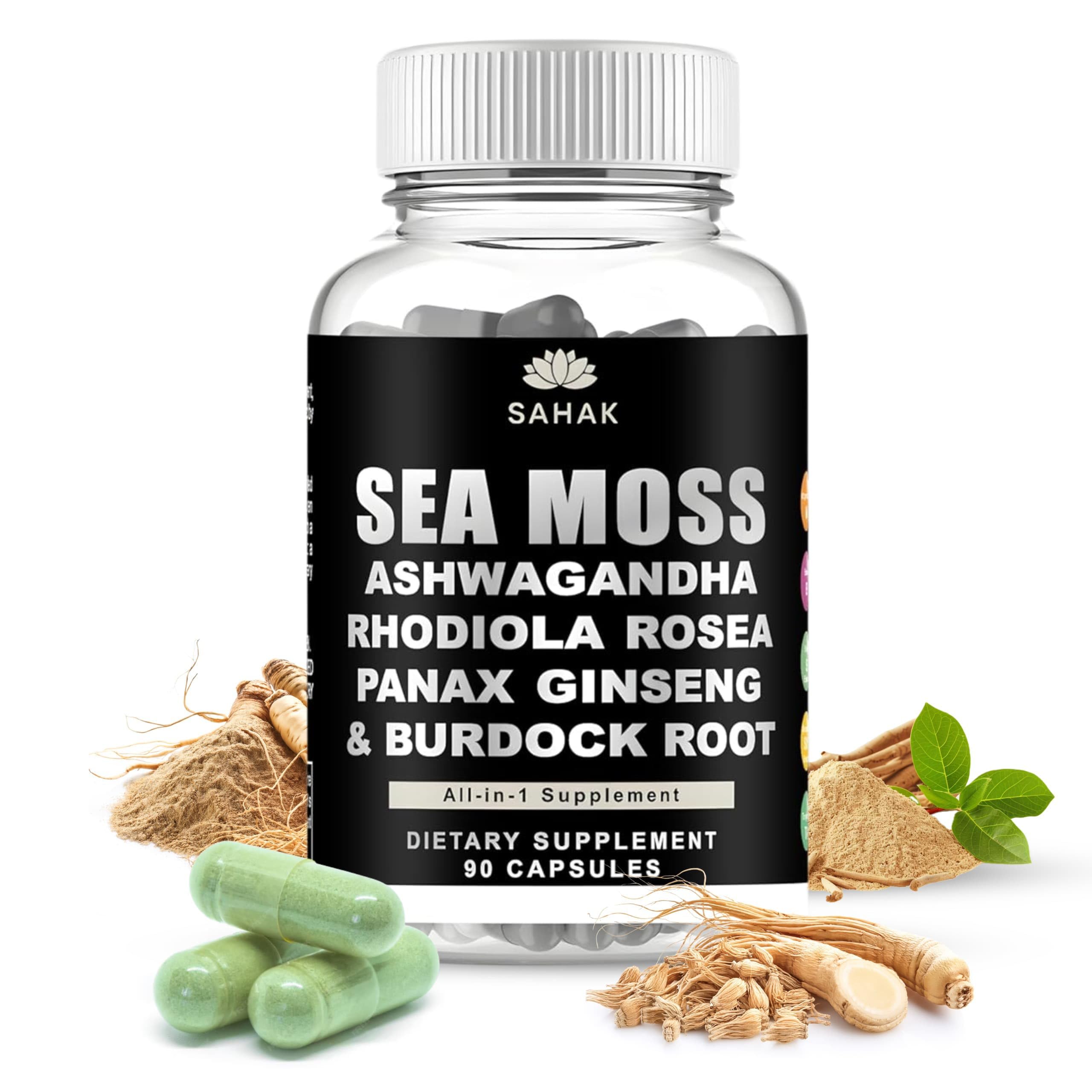 SAHAK Organic Sea Moss Capsules with Ashwagandha, Rhodiola, Panax Ginseng & Burdock Root 90 Vegan Capsules, Lab Tested | Irish Sea Moss Complex for Daily Wellness, Energy & Skin Support