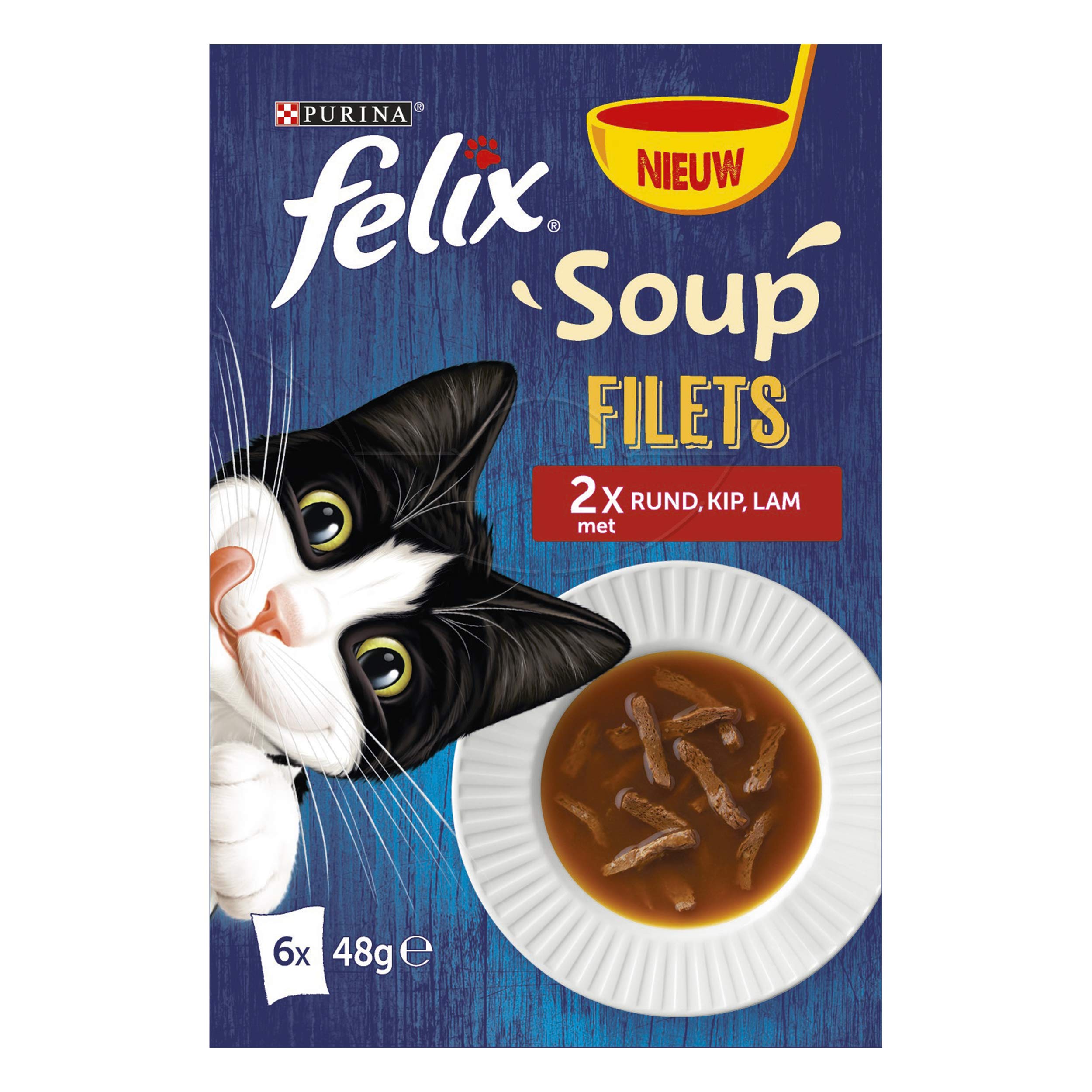 INGREDIENTS Composition with Beef: Meat and animal derivatives (including 4 ), vegetable protein extracts, fish and fish derivatives, sugar, minerals, vegetable derivatives, yeast. Composition with Chicken: Meat and animal derivatives (including 4 chicken), vegetable protein extracts, fish and fish derivatives, minerals, vegetable derivatives, sugar, yeast. Composition with Lamb: Meat and animal derivatives (including 4 lamb), vegetable protein extracts, fish and fish derivatives, sugar, minerals, vegetable derivatives, yeast. FEEDING INSTRUCTIONS Feeding Advice: For a 4kg cat, pour into a bowl and give one pouch per day, in addition to other Purina complete foods. For your cat's health, follow the feeding guidelines. Serve at room temperature. Always ensure fresh, clean drinking water is available. This product is a complementary meal, with a high moisture content: part of the recommended daily water intake is provided by consuming this product.This product provides part of your recommended daily water intake. Perfect size in a gift-ready bag. No added artificial colors, preservatives, or flavors. Made with high-quality ingredients.Felix Soup Filets Soupe de chat aux saveurs Boeuf, poulet et agneau, 6 x 48g - Boîte de 4 (24 sachets de portion 1,15kg)DESCRIPTION DU PRODUIT INGRÉDIENTS Composition avec le boeuf: viande et sous-produits animaux (dont 4 ), extraits de protéines végétales, poissons et sous-produits de poisson, sucre, minéraux, sous-produits végétaux, levure. Composition avec poulet: viande et sous-produits animaux (dont poulet 4 ), extraits de protéines végétales, poisson et sous-produits de poisson, minéraux, sous-produits végétaux, sucre, levure. Composition avec Agneau: viande et sous-produits animaux (dont l'agneau 4 ), extraits de protéines végétales, poissons et sous-produits de poisson, sucre, minéraux, sous-produits végétaux, levure. MODE D'EMPLOI Conseils nutritionnels: Pour un chat de 4kg, versez dans un bol et donnez un sachet de portions par jour, en complément d'autres produits complets de Purina. Pour la santé de votre chat, respectez les conseils nutritionnels. Servir à température ambiante. Assurez-vous que l'eau potable propre et fraîche est toujours disponible. Ce produit est un repas complémentaire, avec une teneur élevée en humidité: une partie de l'apport quotidien recommandé d'eau est fournie par la consommation de ce produit.Une partie de l'apport quotidien recommandé en eau est fournie par la consommation de ce produit. Taille parfaite dans un sac prêt à offrir. Sans colorants, conservateurs ou arômes artificiels ajoutés. Fabriqué avec des ingrédients de haute qualité.