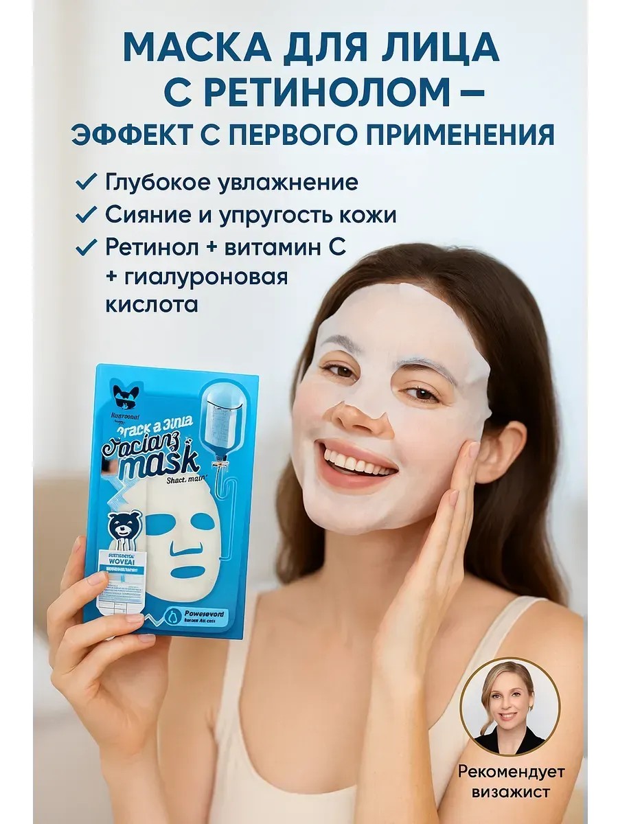 Уходовая маска для лица с ретинолом, витамином C и гиалуроновой кислотой. Смягчает, подтягивает и осветляет кожу. Подходит для всех типов кожи. Набор из 10 штук