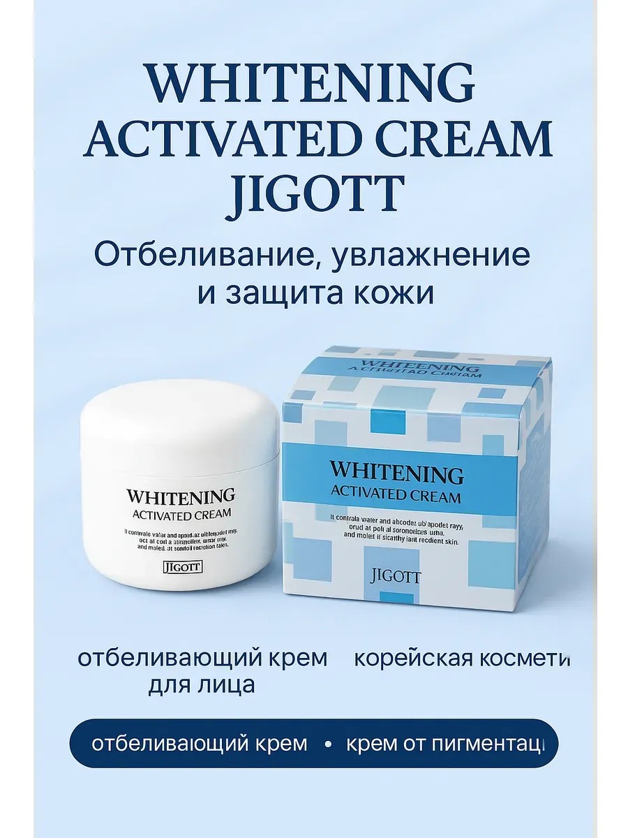 | Полное наименование товара | Whitening Activated Cream Jigott — отбеливающий крем для лица с интенсивным увлажняющим и защитным действием. |