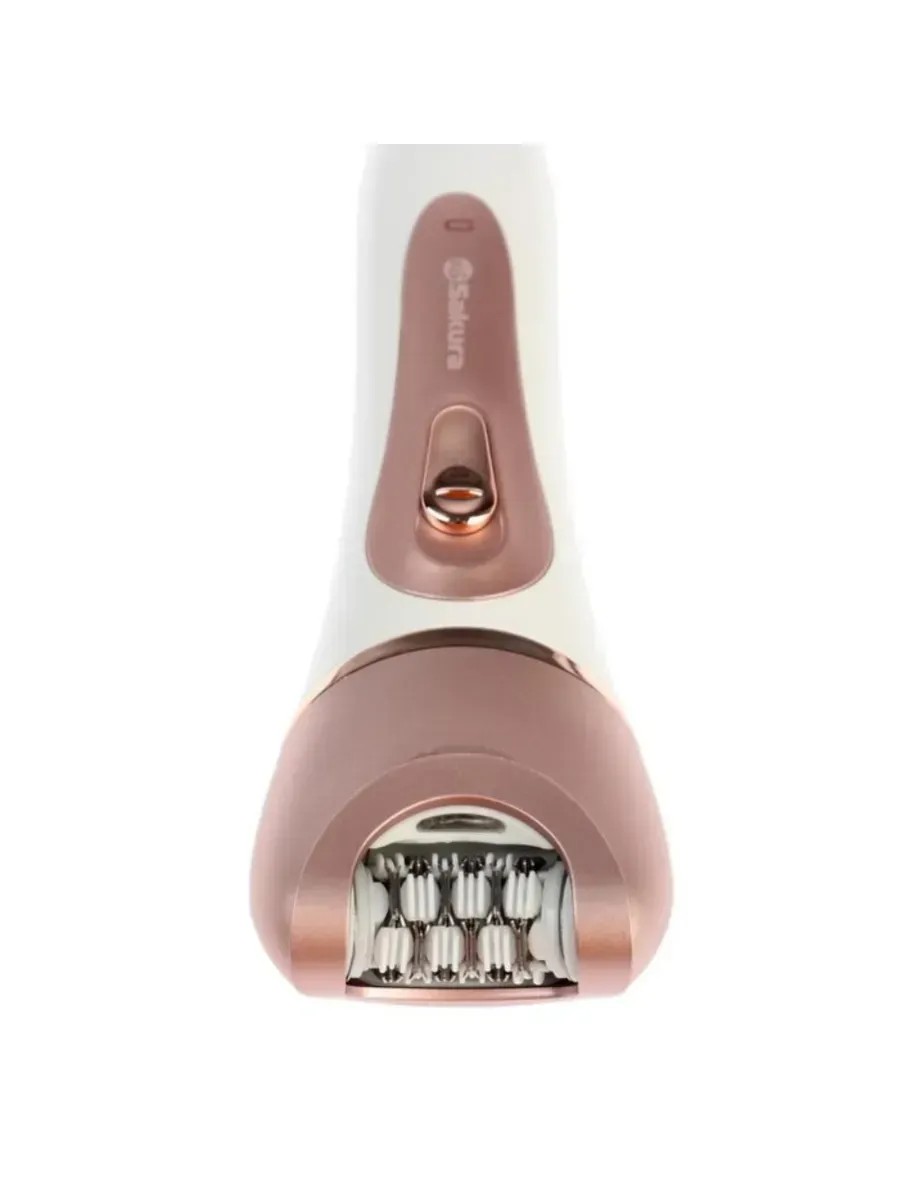 The epilator is equipped with 10 attachments, each designed for specific areas of the body.
