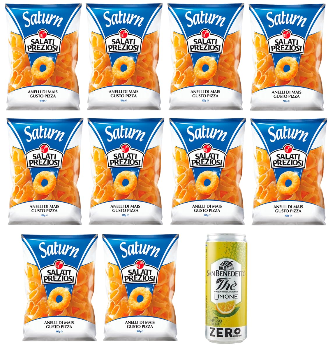 1 pack of sugar-free San Benedetto lemon iced tea - 330ml tin - The free tin is included in all cases and will not be replaced with other products. These pizza-flavored corn chips are a real treat for the taste buds, both for their flavor and their exceptionally crispy texture. Not fried, these chips are perfect for a snack any time of day. Salati Preziosi's Saturnes offer a unique taste experience where the crispiness blends surprisingly well with the pizza flavor. The pizza taste is intense and satisfying with a mix of spices and cheese, and since these chips aren't fried, you can enjoy them guilt-free. Enjoy the taste and the pleasure of their ring shape, which allows you to easily pop these snacks right on your fingers. Ingredients: Corn flour (73 ), sunflower oil, salt, processed cheese powder (6 ) (milk, salt, enzymes, presumed), protein and whey powder, flavor enhancers: E621, salt, flavorings, tomato powder, sulfur dioxide. Nutritional values (per 100 grams): energy 2206 kj 527 kcal, fat 29.40 g, saturates 4 g, carbohydrates 60 g, sugars 1.30 g, protein 4.90 g, salt 2.80 g.Taste and pleasure thanks to their ring shape, allowing you to nibble these snacks directly onto your fingers. The pizza flavor is intense and satisfying with a blend of spices and cheese, and since these chips aren't fried, you can enjoy them guilt-free. Salati Preziosi's Anelli chips offer a unique taste experience where the crispiness blends surprisingly well with the pizza flavor. Being unfried, these chips are perfect for a break any time of day. These pizza-flavored corn chips are a real treat for the palate, both for their taste and their exceptionally crispy texture. The free box is included in all cases and will not be replaced with other products. San Benedetto Sugar-Free Lemon Iced Tea 330ml.1 paquet de thé glacé San Benedetto au citron sans sucre - Boîte de 330 ml - La boîte gratuite est envoyée dans tous les cas et ne sera pas remplacée par d'autres produits. Ces chips de maïs au goût de pizza sont une véritable souris du palais, tant pour leur goût que pour leur texture particulièrement croustillante. Non frites, ces chips sont parfaits pour une pause à tout moment de la journée. Les Saturnes de Salati Preziosi sont une expérience gustative unique où le croustillant se marie de manière surprenante avec le goût de la pizza. Le goût de la pizza est intense et satisfaisant avec un mélange d'épices et de fromage, ainsi que le fait que ces chips ne sont pas frites, vous pouvez donc en profiter sans mauvaise conscience. Goût et plaisir grâce à sa forme en anneau qui vous permet de broquer ces collations directement sur vos doigts. Ingrédients : farine de maïs (73 ), huile de tournesol, sel, fromage fondu en poudre (6 ) (lait, sel, enzymes, présumé), protéines et poudre de lactosérum, exhausteurs de goût : E621, sel, arômes, poudre de tomate, dioxyde de soufre. Valeurs nutritionnelles (pour 100 grammes) : énergie 2206 kj 527 kcal, matières grasses 29,40 g, graisses saturées 4 g, glucides 60 g, sucre 1,30 g, protéines 4,90 g, sel 2,80 g.Goût et plaisir grâce à sa forme en anneau qui vous permet de broquer ces collations directement sur vos doigts. Le goût de la pizza est intense et satisfaisant avec un mélange d'épices et de fromage, ainsi que le fait que ces chips ne sont pas frites, vous pouvez donc en profiter sans mauvaise conscience. Les Anelli de Salati Preziosi sont une expérience gustative unique où le croustillant se marie de manière surprenante avec le goût de la pizza. Non frites, ces chips sont parfaits pour une pause à tout moment de la journée. Ces chips de maïs au goût de pizza sont une véritable souris du palais, tant pour leur goût que pour leur texture particulièrement croustillante. La boîte gratuite est envoyée dans tous les cas et n'est pas remplacée par d'autres produits. !. San Benedetto Boîte de thé glacé au citron sans sucre 330 ml.Salati Preziosi Anelli Lot de 10 chips de maïs pour pizza, chips de 100 g 1 sachet de thé glacé San Benedetto au citron sans sucre 330 ml