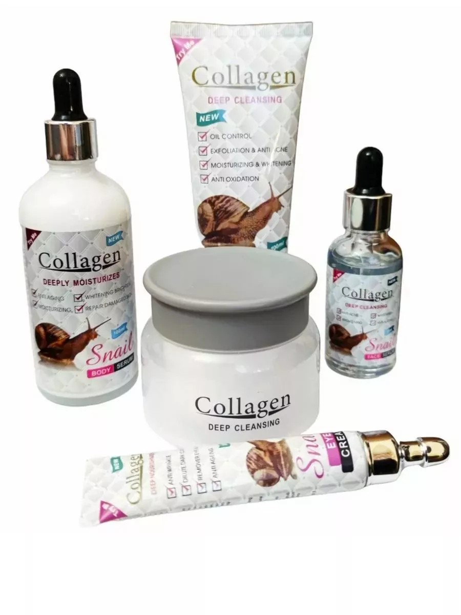 Косметика для лица 5в1. В ассортимент нашего набора входит: сыворотка для тела 100 мл • Пенка для умывания 100 мл • Крем для кожи вокруг глаз 20 мл • Восстанавливающая сыворотка 30 мл. • kрем 80 мл. Collagen Эффективно борется с угревой сыпью, сужает поры и регулирует работу сальных желез, отбеливает кожу и избавляет от пигментных пятен. Делает Lицо чистым, свежим и матовым. . При регулярном применении тон и микрорельеф выравниваются, становится более гладкой и свежей. Легкая текстура, не скатывается и не сушит. Крем для век с муцином улиткой и коллагеном эффективно устраняет темные круги под глазами. Способствует увлажнению, повышает её упругость и эластичность, разглаживает морщины. Восстанавливающая сыворотка дает максимальный эффект гидратации. Средство с легкой желеобразной текстурой мгновенно впитывается, не оставляя ощущения липкости.