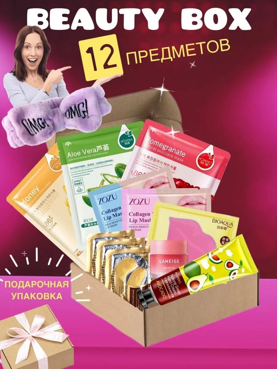 Комплектация3 тканевых масок; 3 патчи для губ; 1 крем для рук; маска для губ; 3 патчи для глаз; Повязка для волос