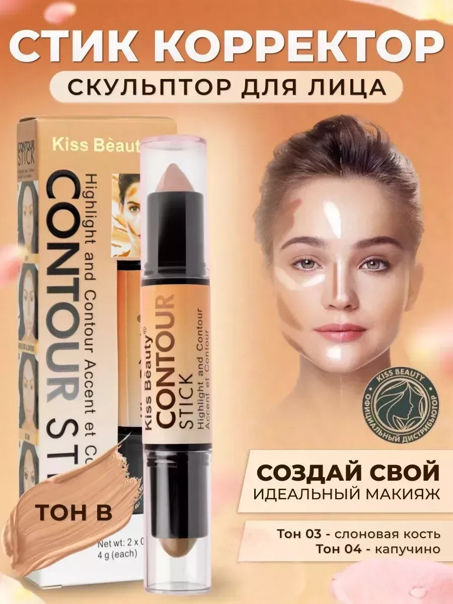 Двухсторонний Стик корректор от Kiss Beauty станет незаменимым помощником в создании как ежедневного, так и вечернего макияжа. Двухсторонний консилер для контуринга 2 в 1 предназначен для коррекции рельефа лица и создания выразительного макияжа Стик-скульптор поможет вам скорректировать овал лица и создать выразительный макияж. Кремовый Консилер-Скульптор выполнен в виде стика, что значительно уменьшает потраченное время нанесения макияжа. Стик удобно держать в руке, и для его нанесения не требуются дополнительные кисти. Нежная, кремообразная гладкая текстура стика позволяет быстро, равномерно скорректировать черты лица при скульптурировании. Средство подходит для всех типов кожи. Тона безупречно подобраны под холодные и теплые оттенки кожи. Консилер является неотъемлемой частью косметики для макияжа, ухода за лицом и даже средством от прыщей! Консилер для лица поможет создать скульптуру лица, подчернуть контур вокруг век, глаз, бровей, скул и носа, его можно использовать и как тональник. Консилер тоналка, как и другие виды женской декоративной уходовой косметики для макияжа, как скульптор для лица и тональный крем для лица, обеспечивает идеальный контуринг лица и маскировку любых недостатков. Корректор содержит коллаген и натуральную минеральную основу, что позволяет относить его к более органической и профессиональной косметике. Двусторонний механический карандаш-стик, сочетающий в себе свойства хайлайтера и контура, позволит скорректировать рельеф лица, отвлечь внимание от недостатков и подчеркнуть достоинства. Хайлайтер, с одной стороны, стика поможет замаскировать темные круги под глазами, покраснения, неровности и пост-акне. А также Хайлайтер поможет вам расставить бликовые акценты, и высветлить отдельные зоны лица. Темная сторона стика поможет вам скорректировать овал лица. Скорректировать носик и выделить скулы.