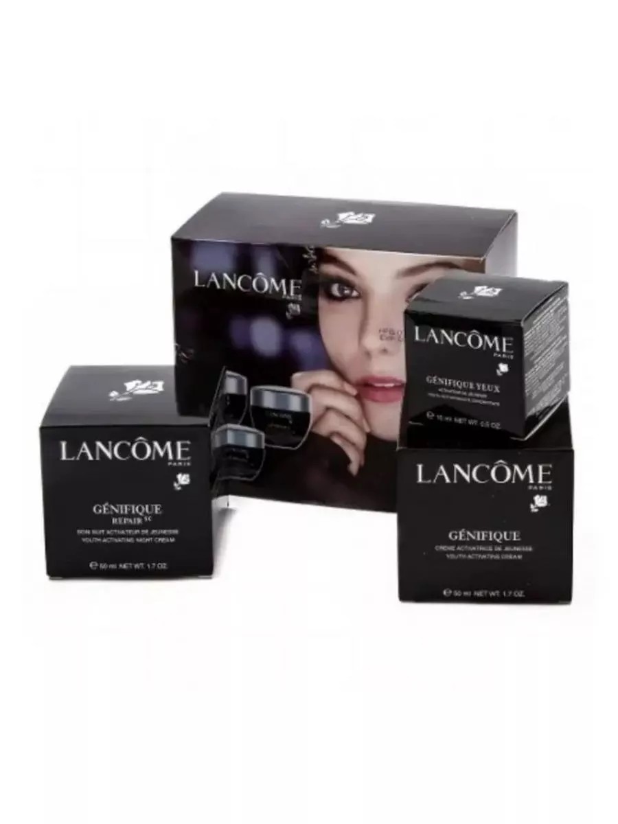 Косметический набор "Genifique" - это активатор молодости и увлажняющий крем для дневного и ночного ухода, а также уходовый крем для глаз. Активатор подходит для девушек от 25 лет, дневной крем интенсивно увлажняет и питает кожу, а ночной крем обладает оживляющим эффектом. Крем для глаз предотвращает появление морщин, разглаживает мелкие линии, придает свежий вид и делает кожу более упругой. Все средства могут использоваться в любом возрасте и для любого типа кожи.