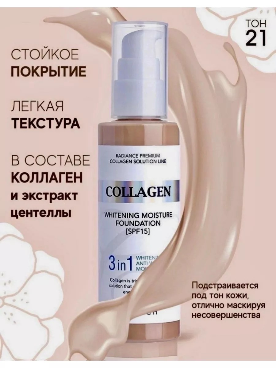 Collagen Enough Moisture Foundation with SPF 15 sun protection. This foundation helps conceal any skin imperfections, such as acne scars, redness, and pigmentation. This SPF-containing cream is also anti-aging; it's lightweight and offers long-lasting coverage. It doesn't dry out the skin and gives the face a healthy glow. Collagen smoothes the skin's texture and evens out tone. Centella asiatica extract has anti-inflammatory and wound-healing properties. The color of the foundation is Ivory No. 21 beige. You can achieve both a radiant effect and a matte finish. Directions: Apply the foundation with a sponge to damp skin. We wish you happy shopping!