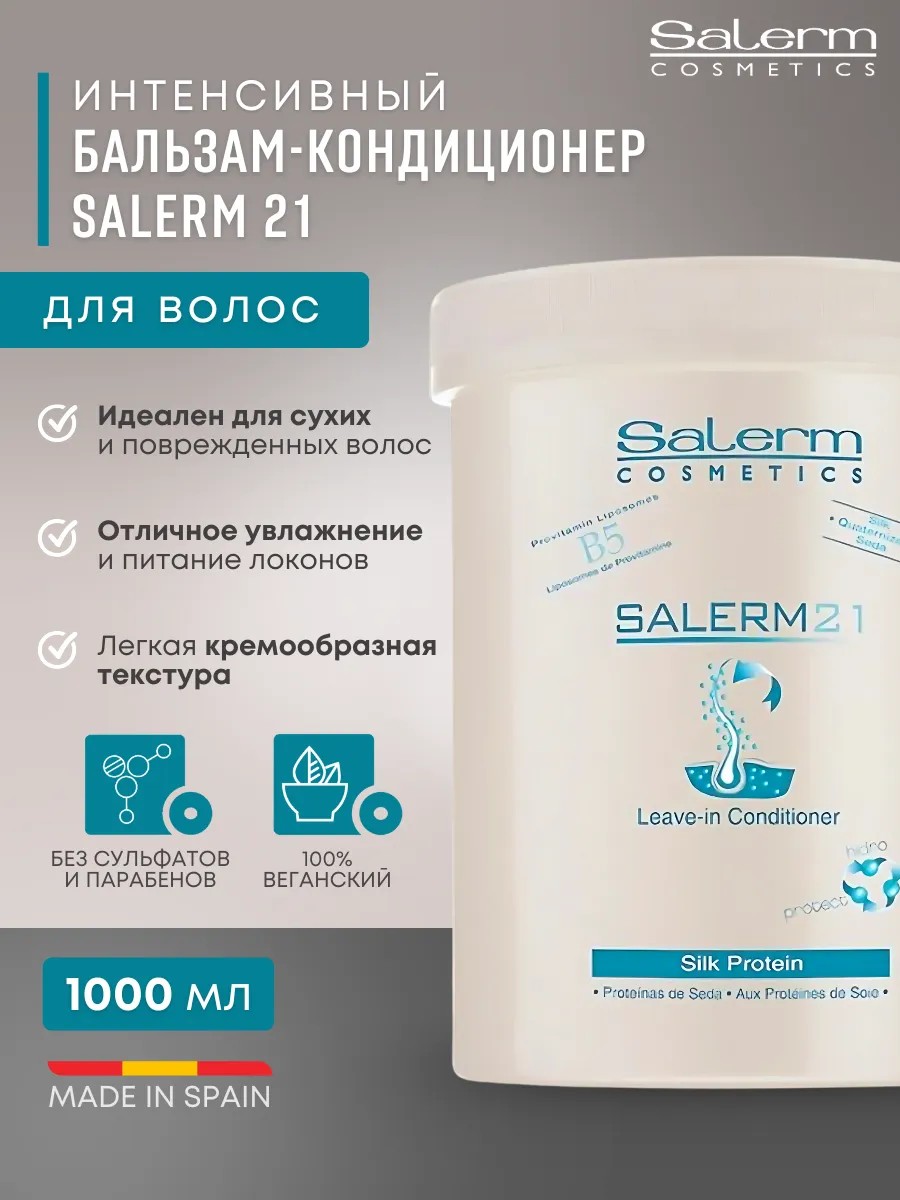 Женский кондиционер Салерм 21 от salerm cosmetics предназначен для ухода за волосами любого типа. Благодаря кремообразной текстуре легко наносится и смывается, кондиционируя и облегчая волосяной покров, придавая естественный прикорневой объем без пушистости. Детокс метод против перхоти и зуда. Бальзам для гладкости и выпрямления интенсивно увлажняет и питает волоски, восстанавливая, смягчая и дисциплинируя локоны, насыщает волосы витаминами, способствуя их укреплению, эластичности, росту и дает эффект термозащиты. Активные компоненты: Гиалуроновая кислота питает фолликулы, способствует улучшению циркуляции и обмену веществ в коже головы, снижая выпадение волос и активируя рост новых. Стимулирует процесс увеличения выработки эластина, коллагена и кератина, повышая прочность и блеск прядей без глицерина и пантенола. Протеины жидкого шелка легко оседают на поверхности волос и кожи, образуя легкую защитную пленку, оберегающую их от негативных внешних воздействий и потери влаги. Прекрасно подойдет блондинкам как стабилизатора блонда без желтого цвета и нейтрализации желтизны. Обладают эффективными витаминно кондиционирующими свойствами для волосяного и кожного покровов. Провитамин В5 и витамин Е регенерируют и укрепляют волоски, придавая локонам прочность и позволяя им быть гладкими. Ускоряют рост волос и способствуют увеличению их диаметра. Профессиональную испанскую уходовую косметику, известную своим качеством, оценит профессионал, парикмахер, эксперт. Салоны красоты могут приобрести сразу большой объем. Мужчины и женщины останутся довольны ароматной отдушкой. Способы применения: Увлажнение: перед использованием средства вымойте волосы шампунем Salerm 21 Shampoo. Нанесите кондиционер в качестве ополаскивателя. Не смывайте. Уложите волосы. Маска: Нанести 5-10 мл кондиционера по всей длине чистых волос. Оставить для воздействия на 4-6 минут. Смыть водой. Защита от ломкости: Нанесите средство на сухие пряди от корней до кончиков. Выполните обычную укладку,