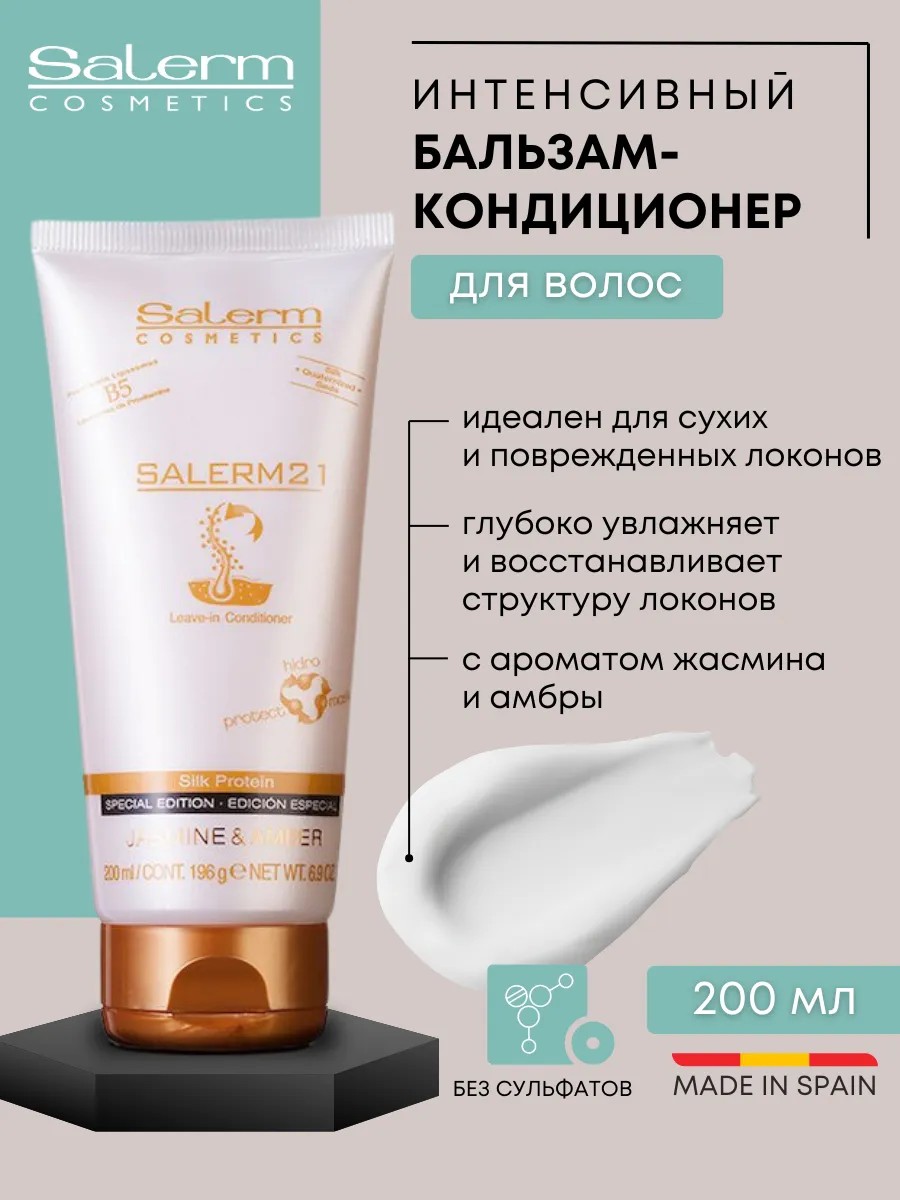 Женский кондиционер Салерм 21 от salerm cosmetics предназначен для ухода за волосами любого типа. Благодаря кремообразной текстуре легко наносится и смывается, кондиционируя и облегчая волосяной покров, придавая естественный прикорневой объем без пушистости. Детокс метод против перхоти и зуда. Бальзам для гладкости и выпрямления интенсивно увлажняет и питает волоски, восстанавливая, смягчая и дисциплинируя локоны, насыщает волосы витаминами, способствуя их укреплению, эластичности, росту и дает эффект термозащиты. Активные компоненты: Гиалуроновая кислота питает фолликулы, способствует улучшению циркуляции и обмену веществ в коже головы, снижая выпадение волос и активируя рост новых. Стимулирует процесс увеличения выработки эластина, коллагена и кератина, повышая прочность и блеск прядей без глицерина и пантенола. Протеины жидкого шелка легко оседают на поверхности волос и кожи, образуя легкую защитную пленку, оберегающую их от негативных внешних воздействий и потери влаги. Прекрасно подойдет блондинкам как стабилизатора блонда без желтого цвета и нейтрализации желтизны. Обладают эффективными витаминно кондиционирующими свойствами для волосяного и кожного покровов. Провитамин В5 и витамин Е регенерируют и укрепляют волоски, придавая локонам прочность и позволяя им быть гладкими. Ускоряют рост волос и способствуют увеличению их диаметра. Профессиональную испанскую уходовую косметику, известную своим качеством, оценит профессионал, парикмахер, эксперт. Салоны красоты могут приобрести сразу большой объем. Мужчины и женщины останутся довольны ароматной отдушкой. Способы применения: Увлажнение: перед использованием средства вымойте волосы шампунем Salerm 21 Shampoo. Нанесите кондиционер в качестве ополаскивателя. Не смывайте. Уложите волосы. Маска: Нанести 5-10 мл кондиционера по всей длине чистых волос. Оставить для воздействия на 4-6 минут. Смыть водой. Защита от ломкости: Нанесите средство на сухие пряди от корней до кончиков. Выполните обычную укладку,