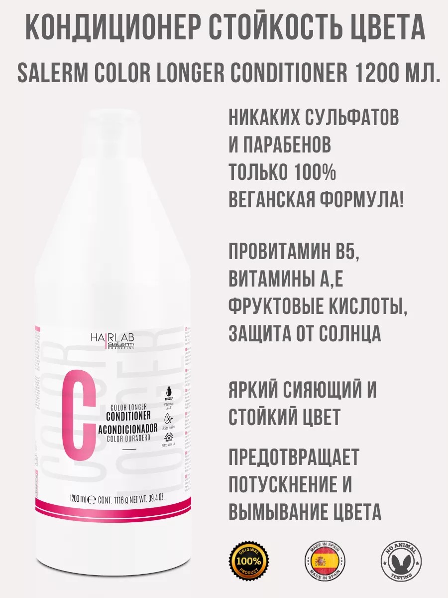 Профессиональный кондиционер для окрашенных волос Salerm Color Longer Conditioner из новой линейке Hair Lab Салерм с фруктовыми кислотами и провитамином B5 специально разработан для окрашенных и обесцвеченных волос. Он подходит для запечатывания и сохранения цвета, обеспечивая яркий, блестящий и стойкий результат,придает волосам блеск и мягкость.