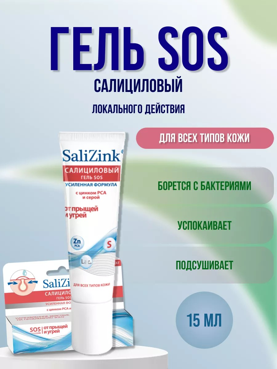 Гель SOS SaliZink применяется для точечного воздействия на прыщи. Активные компоненты в составе борются с бактериями, провоцирующими акне, успокаивают кожу и подсушивают воспаления.