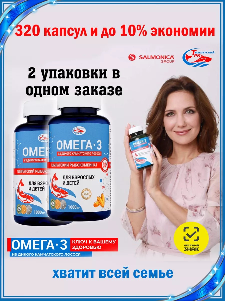 2 упаковки 320 капсул. Омега 3 капсулы камчатская ( не таблетки ) 1000 или 600 мг Тымлатского рыбокомбината Россия. Бад камчатский натуральный из дикой рыбы дорогих сортов. Витаминный комплекс пищевой детский и взрослый в капсулах (камчатка) из рыбного жира содержит в себе незаменимые полиненасыщенные жирные кислоты: ЭПК ( эйкозапентаеновая кислота , EPA ) и ДГК ( докозагексаеновая кислота , DHA ). Пищевая добавка Омега-3 халяль правильно усваивается, а значит экологичнее других омег из рыбы дешевых пород для иммунитета. Рыбный жир добывают из мышечной ткани. Такой продукт чище и безопаснее. А рыбий жир из печени, источником не только витаминов, но и вредных токсинов, которые рыба накапливает на протяжении жизни. Омега три - формула здорового образа жизни ЗОЖ в любом возрасте. Omega3 1000мг комплексные витамины и минералы для женщин молодых и пожилых при климаксе. Omega 3 подходит детям с 7 лет , женщинам , для подростков , девушек , мужчин и спортсменов (спорт). Витаминно минеральный состав насыщает организм витаминами A и D, что поддержит здоровье сердца при сердечно-сосудистых осложнениях взрослого, для похудения и памяти. Помогает в устранении прыщей у подростка (чистка организма), проявлений аллергии, кожных проблем, провоцирует ускорение обмена веществ и очищение сосудов. Улучшение работы мозга (для памяти), почек и уменьшение воспаления. Без усталости и против выпадения и улучшения роста волос. А также называют витамин против стресса - это чистая энергия. Если ищете правильный источник омега 3 6 9 для беременных и для лактации - то стоит попробовать продукцию бренда Salmonica. Подходит для взрослых и детей ( роста ), не содержит сахара и ГМО. Витаминные комплексы женские мужские и детские - капсулы желатиновые с кислотами рекомендован при дефиците в организме жирных кислот. Показания: слабый иммунитет, ломкие волосы и ногти, сухая кожа. Детям витамины амега 3 необходимы для роста костей, умственного развития (ума), концентрации внимания. Для глаз зубов и кожи. Суставов и связок. Источник полиненасыщенных жирных кислот 3-6-9 - продукты из дикого лосося камчатки для красоты ногтей и укрепления волосяного покрова. Определенно попробуйте продукты и препараты Салмоника уже сегодня и сделайте шаг к улучшению здоровья. Детский омега-3 необходим для концентрации внимания, поддержания имунитета. Витамины и бады взрослым - капсула массой 1000 мг или 600мг и детская омега3