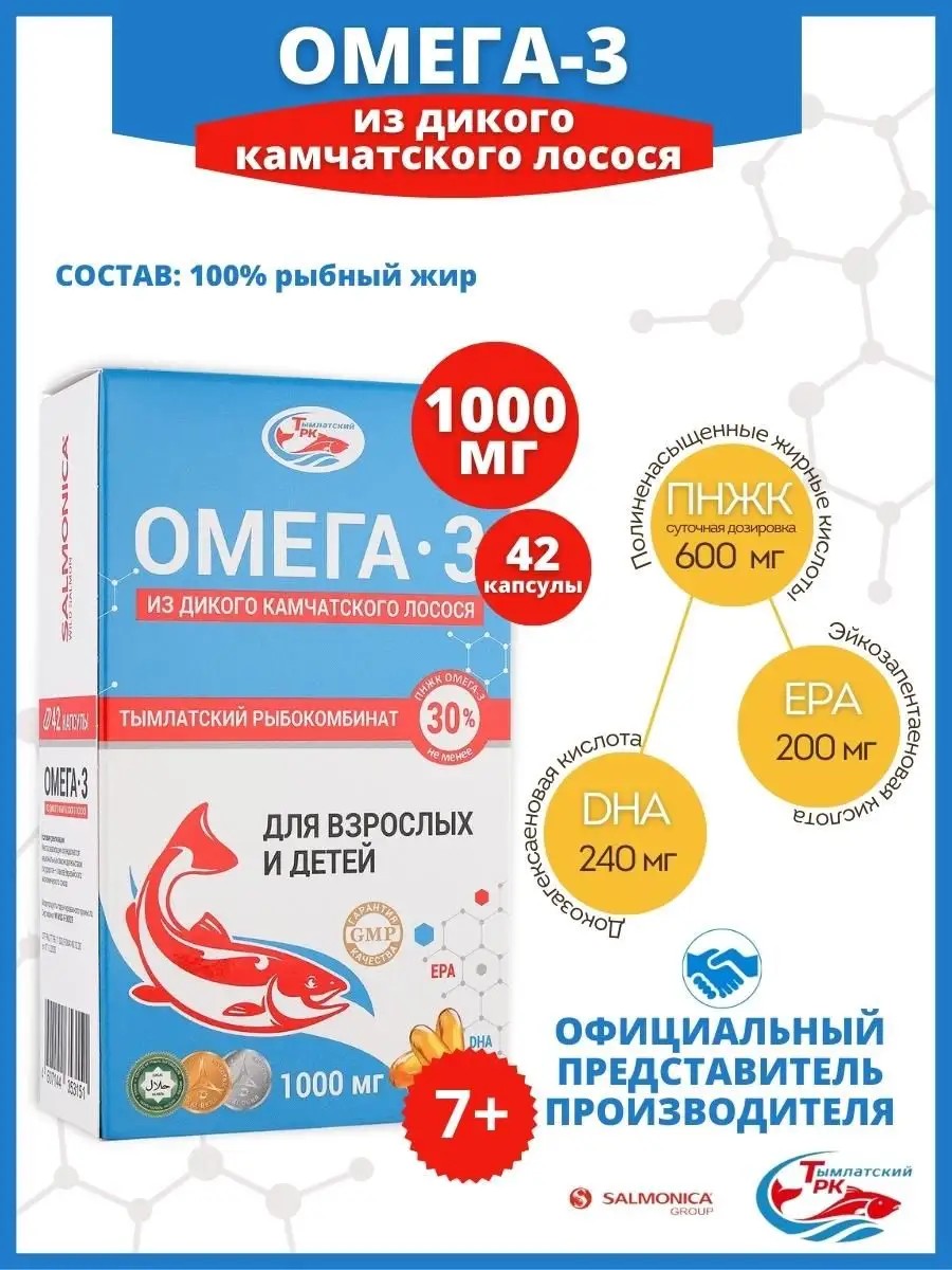 Омега 3 капсулы камчатская ( не таблетки ) 1000 или 600 мг Тымлатского рыбокомбината Россия. Бад камчатский натуральный из дикой рыбы дорогих сортов. Витаминный комплекс пищевой детский и взрослый в капсулах (камчатка) из рыбного жира содержит в себе незаменимые полиненасыщенные жирные кислоты: ЭПК ( эйкозапентаеновая кислота , EPA ) и ДГК ( докозагексаеновая кислота , DHA ). Пищевая добавка Омега-3 халяль правильно усваивается, а значит экологичнее других омег из рыбы дешевых пород для иммунитета. Рыбный жир добывают из мышечной ткани. Такой продукт чище и безопаснее. А рыбий жир из печени, источником не только витаминов, но и вредных токсинов, которые рыба накапливает на протяжении жизни. Омега три - формула здорового образа жизни ЗОЖ в любом возрасте. Omega3 1000мг комплексные витамины и минералы для женщин молодых и пожилых при климаксе. Omega 3 подходит детям с 12 лет , женщинам , для подростков , девушек , мужчин и спортсменов (спорт). Витаминно минеральный состав насыщает организм витаминами A и D, что поддержит здоровье сердца при сердечно-сосудистых осложнениях взрослого, для похудения и памяти. Помогает в устранении прыщей у подростка (чистка организма), проявлений аллергии, кожных проблем, провоцирует ускорение обмена веществ и очищение сосудов. Улучшение работы мозга (для памяти), почек и уменьшение воспаления. Без усталости и против выпадения и улучшения роста волос. А также называют витамин против стресса - это чистая энергия. Если ищете правильный источник омега 3 6 9 для беременных и для лактации - то стоит попробовать продукцию бренда Salmonica. Подходит для взрослых и детей ( роста ), не содержит сахара и ГМО. Витаминные комплексы женские мужские и детские - капсулы желатиновые с кислотами рекомендован при дефиците в организме жирных кислот. Показания: слабый иммунитет, ломкие волосы и ногти, сухая кожа. Детям витамины амега 3 необходимы для роста костей, умственного развития (ума), концентрации внимания. Для глаз зубов и кожи. Суставов и связок. Источник полиненасыщенных жирных кислот 3-6-9 - продукты из дикого лосося камчатки для красоты ногтей и укрепления волосяного покрова. Определенно попробуйте продукты и препараты Салмоника уже сегодня и сделайте шаг к улучшению здоровья. Детский омега-3 необходим для концентрации внимания, поддержания имунитета. Витамины и бады взрослым - капсула массой 1000 мг или 600мг - детская омега3