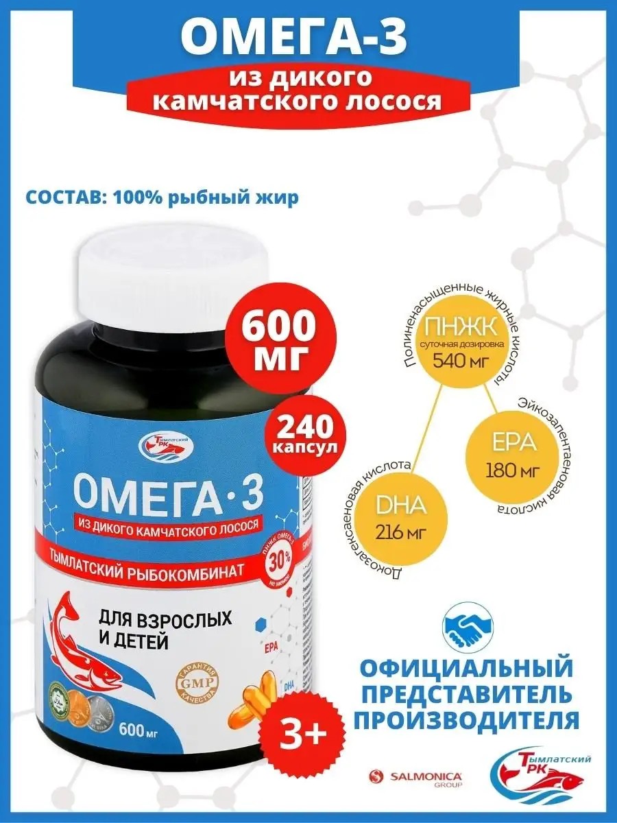 Омега 3 из дикого камчатского лосося от Тымлатского Рыбокомбината - это высококачественный рыбный жир ( не рыбий жир ) с высоким содержанием полиненасыщенных жирных кислот ПНЖК до 30%, Эйкозапентаеновая кислота (EPA) не менее 14%, Докозагексаеновая кислота (DHA) не менее 12%. Полиненасыщенные жирные кислоты относятся к незаменимым, так как не синтезируются в организме человека и должны поступать в достаточном количестве извне. Регулярный прием Омега-3 капсулы способствует: нормальному функционированию органов и систем организма, стенок сосудов, нервных клеток. Также красоты , здоровья волос , кожи и ногтей. Омега3 с жирными кислотами помогает организму бороться с вирусами, снижает уровень холестерина. БАД для глаз Омега 3 в капсулах показана взрослым, детям, беременным, пожилым людям. Витамин Омега в капсулах для мужчин и женщин. Витаминный комплекс Омега 3 600 мг - поможет улучшить здоровье и укрепить иммунитет. Состав Omega 3 от Salmonica: 100% рыбного жира из дальневосточных лососевых видов рыб , желатин пищевой , глицерин , вода. По 1 капсуле 2-3 раза в день. Витамины для иммунитета , здоровья и красоты всей семьи. Для беременных , для женщин , для мужчин и для детей. Биологически активная добавка Omega3 предназначена для питания и поддержания организма. Каждая капсула содержит активные вещества , которые необходимы для правильного функционирования клеточного и системного уровней организма. Формула похудения способствует снижению уровня холестерина , сжиганию жировых отложений и укреплению сердечно-сосудистой системы и суставов. Не является лекарством и не заменяет полноценное питание. Омега3 от Салмоника рекомендовано принимать в период беременности и лактации. Беременные и кормящие матери могут принимать детский БАД без ограничений , так как данный продукт не содержит вредных веществ. Омега жирные кислоты детские также полезны для подростков , которые находятся в периоде активного роста и развития. А также провоцирует снижение веса и возможность похудеть. Содержит только натуральные компоненты , которые добыты на экологически чистых территориях Камчатки. Производится с соблюдением всех стандартов качества и безопасности. В суточном приеме омега-3 600 мг.содержится: ПНЖК Омега-3 - 540 мг. Эйкозапентаеновая кислота (EPA) - 216 мг. Докозагексаеновая кислота (DHA) - 180 мг. СОСТАВ: 1 капсула содержит (по 600 мг) рыбного жира из дальневосточных лососевых видов рыб (в т.ч., дикого камчатского лосося) (ПНЖК омега-3 – не менее 30%), желатин, глицерин (агент влагоудерживающий), вода, смесь токоферолов (антиокислитель). Принимать следует по 1-2 капсулы в день после еды. Срок хранения витаминов 36 месяцев с даты производства. Таблетки помогут вам поддерживать здоровье и укрепить иммунную систему. Он не только полезен для беременных и кормящих матерей , но и для людей , которые ведут активный образ жизни. Омега 3 6 9 жирные кислоты мужские и женские– это пищевая добавка и похудение.