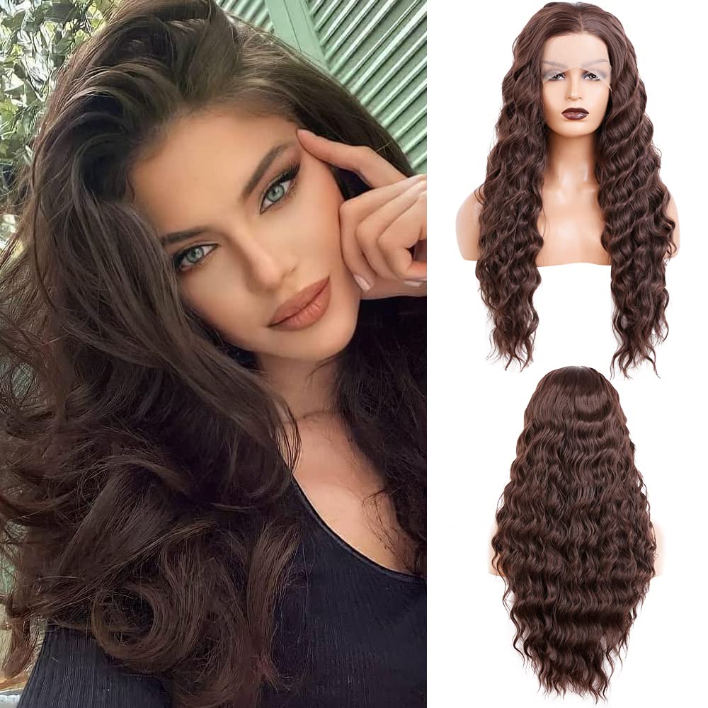 Salomezklm Perücke mit Lace-Front, gewelltes Haar, braun, lange Perücken, klebstofflos, hitzebeständig, Kunsthaar, Lace-Front-Perücke für modische Frauen (dunkelbraun, 61 cm)