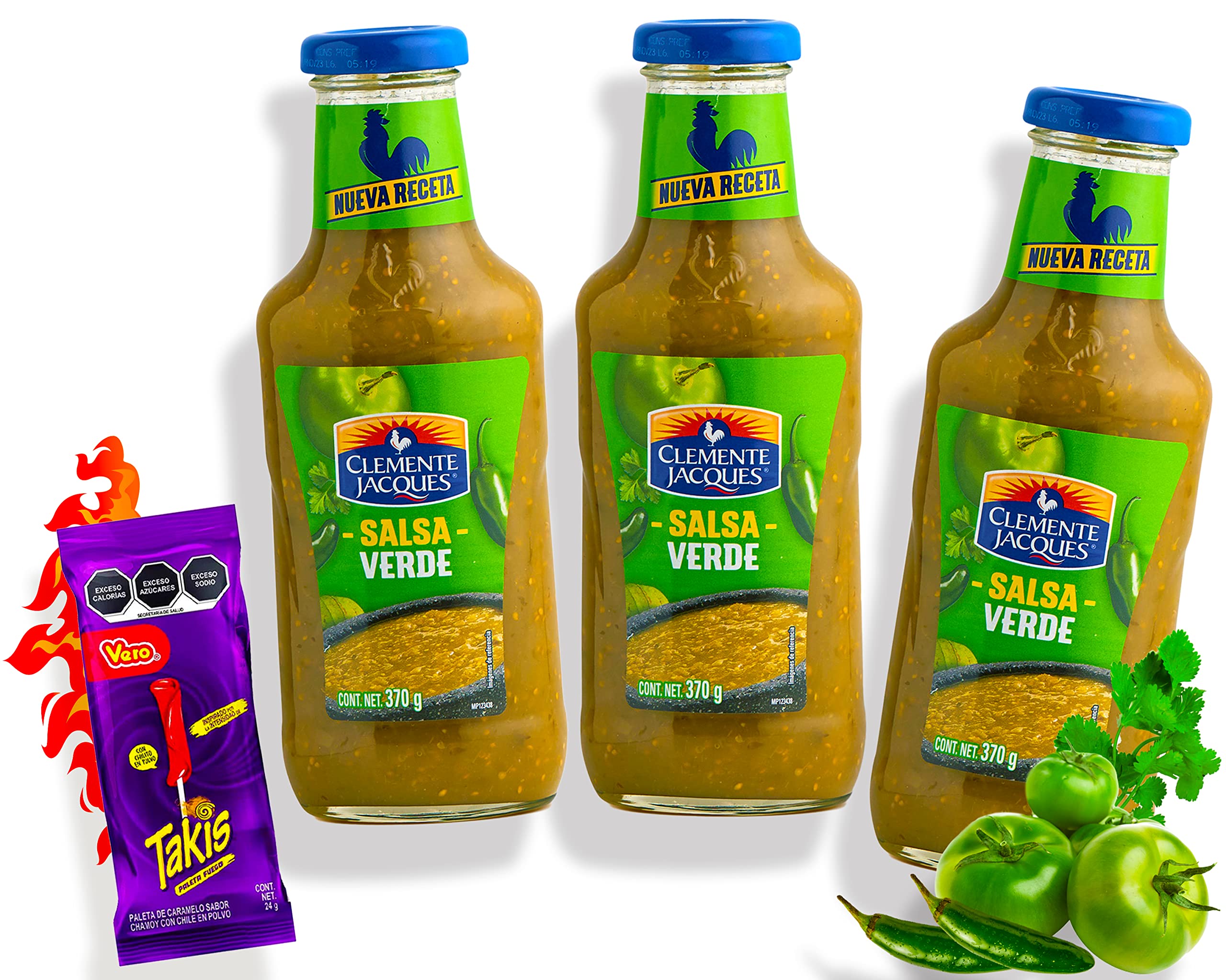 Salsa Verde Scharfe Soße Set - (Pack von 3) Grüne soße Hot Sauce Set Tomaten Chili Sauce aus Mexiko Clemente Jacques plus Takis Fuego Lollipop (Pack von 3) Grüne soße Hot Sauce Set Tomaten Chili Sauce aus Mexiko Clemente Jacques