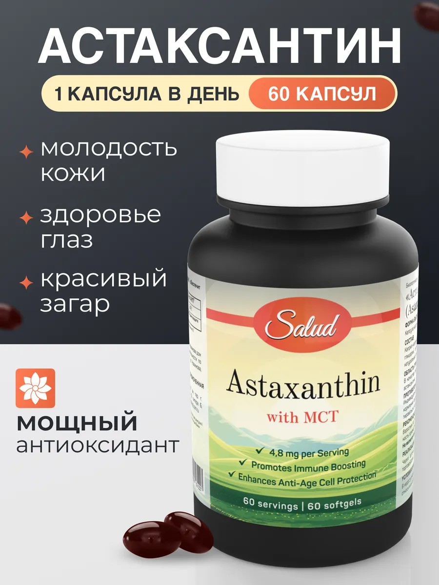 Вся польза в максимальной дозировке 240% в одной капсуле с маслом MCT усиленного действия. Как и все каротиноиды, астаксантин усваивается вместе с жирными кислотами. Астаксантин в комплексе Salud работает совместно с маслом МСТ ( Medium-chain triglyceride), которое повышает биодоступность и усиливает действие астаксантина. Каждая капсула содержит 4.8 мг астаксантина.В каждой упаковке Salud Astaxanthin with MCT находится 60 капсул по 330 мг.