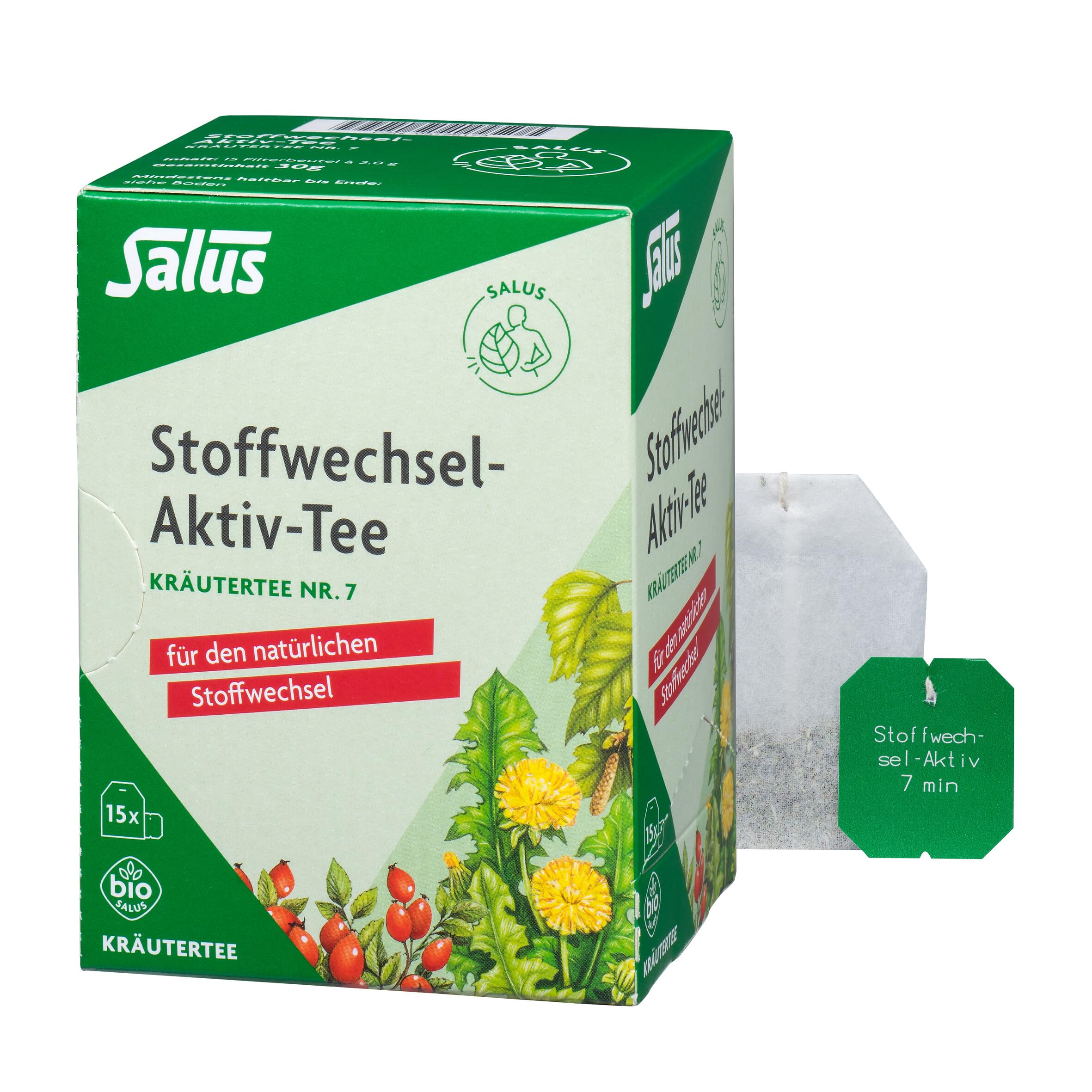 For natural metabolism. Salus quality since 1916. Handling and Storage Instructions: Store in a cool, dry, and dark place. Special Features: No genetic engineering, gluten-free, vegan vegetarian, no added flavorings, laboratory-tested SALUS quality. Preparation: Pour 200 ml of boiling water over the filter bag in a cup and let it steep for approximately 7 minutes. Then remove the filter bag. INGREDIENTS Dandelion leaves , birch leaves , heather , goldenrod , bitter fennel seeds , rosehip peel , peppermint leaves , cornflower . Organically grownNatural product. Gluten-free. A sachet protects the aromas. Contains only carefully selected and particularly aromatic plant parts. Stimulates the natural metabolism.Salus -Tisane Bio No.7 - Plantes agissant sur le métabolisme - 15 sachets de 30gDESCRIPTION DU PRODUIT DESCRIPTION DU PRODUIT Pour le métabolisme naturel. Qualité Salus depuis 1916. Instructions pour la manipulation et le stockageConserver in un endroit sec, frais et sombre. Particularités :sans agro-génétique ingénierie, sans gluten, végétalien végétarien, sans arômes ajoutés, qualité SALUS testée en laboratoirePréparation :Versez 200 ml d'eau bouillante sur le sac filtre dans une tasse et laissez infuser environ 7 minutes. retirer ensuite le sac filtrant. INGRÉDIENTS Feuilles de pissenlit , feuilles de bouleau , bruyère , verge d'or , fruits de fenouil amer , écorces d'églantier , feuilles de menthe poivrée , centaurée . ) issus de l'agriculture biologiqueProduit naturel. Sans gluten. Un sachet protège les arômes. Ne contient que des parties de plantes soigneusement sélectionnées et particulièrement aromatiques. Stimule le métabolsime naturel.