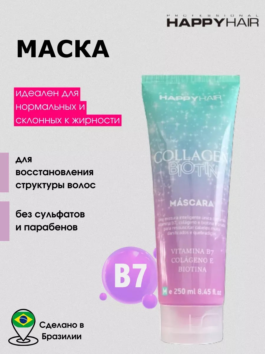 Бессульфатная маска для волос HAPPY HAIR Collagen & Biotin 250 мл разработана для тщательного ухода за вашими волосами, обеспечивая им восстановление, блеск и здоровье. Профессиональный домашний уход за волосами. Лидирующая мировая марка бразильского кератинового выпрямления и восстановления волос HAPPY HAIR представляет домашний уход для всех типов волос. Бразильские технологии бренда непрерывно работают над созданием инновационных профессиональных продуктов для ухода за волосами, используют лучшие ингредиенты. Линейка HAPPY HAIR направлена на сохранение и продление эффекта от процедур кератинового выпрямления, ботокса для волос, нанопластики волос. Подходит для нормальной и склонной к жирности кожи головы, для поврежденных волос. Формула этой линейки содержит: Витамин В7, Биотин - способствует укреплению и росту волос, понижает активность сальных желез. Коллаген - препятствует появлению ломкости и выпадению волос, стимулирует рост и поддерживает здоровье волосяных луковиц. Масло ягоды Асаи - обладает питательными, увлажняющими, восстанавливающими свойствами. Масло Пачули - нормализует выработку кожного сала, снимает воспаления, увлажняет и разглаживает. Экстракт Маракуйи - снимает покраснения и снижает кожный зуд, стимулирует микроциркуляцию, увлажняет, смягчает, тонизирует. Экстракт виноградных косточек - повышает эластичность, снижает ломкость волос и придает им блеск. Для лучшего эффекта необходимо использовать весь комплект Collagen & Biotin из шампуня, маски и масла. Маска Хеппи хаир не содержат сульфатов и других агрессивных веществ. Особенностью является маленький расход. Подходит для ежедневного применения. Волосы становятся шелковистыми и блестящими уже после первого применения. Формула образует невидимую защитную пленку, предотвращая повреждение волос от воздействия окружающей среды и тепловых инструментов. Способ применения: нанести маску на влажные волосы, оставить на 5-10 минут, затем смыть водой.