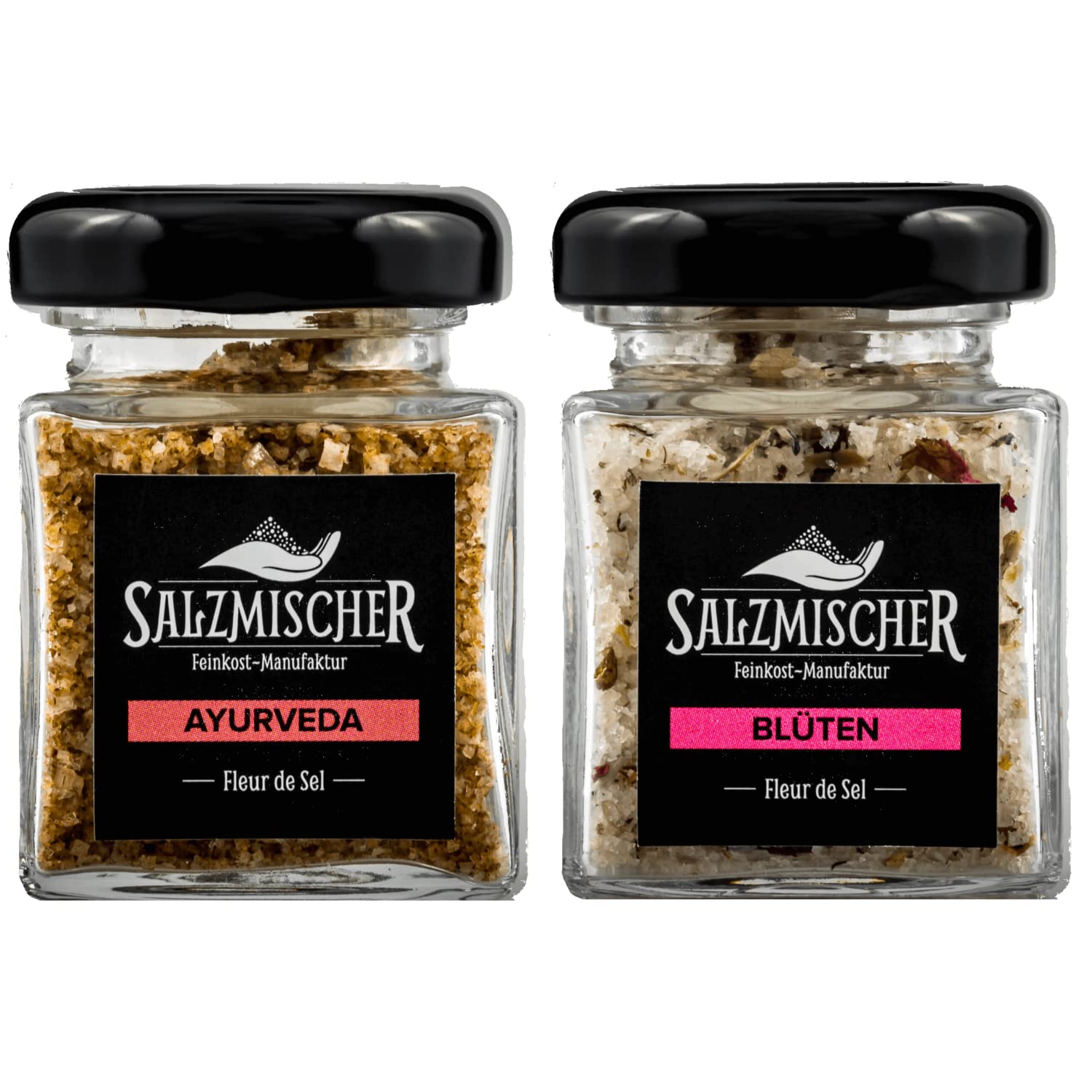The perfect gift idea for a birthday, wedding, or Christmas. Everyone needs to eat, and this gift will certainly be used. Treat your loved ones to a special moment with Salin's premium salts. Quality: In my search for the best salt, I discovered Fleur de Sel de Guérande in France. It is characterized by a particularly mild yet crisp taste and offers an incomparable spice. And just as fresh as we buy the sea salt from our salt merchant, it arrives at your door. For our salt blends, we use only carefully selected, high-quality ingredients. The creations of the finest fleur de sel, with their perfectly coordinated flavors and aromas, are ideal for everyday use and gourmet cooking. To preserve the delicate aroma of the salt crystals, you should add premium sea salt to your dishes after cooking. Simply rub it gently with your fingers to enjoy the perfect taste experience. Gourmet Salt - Ayurveda: Ingredients: sea salt (Guérande fleur de sel), ginger, fenugreek, cardamom, coriander seed, lemongrass, star anise, cinnamon, orange. Perfect for: vegetables, poultry, pasta, rice, stews, soups. This gourmet salt blend is a stimulating salt mix with the unique taste of our fleur de sel. Guérande salt combines special spices and herbs from Ayurvedic cuisine. Its curative and stimulating action stimulates the appetite, stabilizes vata (movement), and strengthens pitta (energy) and kapha (cohesion). Furthermore, this very special blend has an aphrodisiac effect. Ayurvedic nutrition differentiates between mental, emotional, and physical effects. The dietary plan is tailored to individual needs for bodily tissue renewal, healing, happiness, or.Coffret cadeau élégant avec 2 x 35 g d'ayurveda et des fleurs de sel - Mélange de sel - Idée cadeau parfaite (set 2 : Ayurveda, fleurs)DESCRIPTION DU PRODUIT Idée cadeau parfaite pour un anniversaire, un mariage ou pour Noël. Tout le monde doit manger et son cadeau sera certainement utilisé. Préparez à vos proches un beau moment avec les sels de qualité supérieure de salin. Qualité : à la recherche du meilleur sel, j'ai tombé sur la Fleur de Sel de Guérande en France. Il se caractérise par un goût particulièrement doux mais croustillant et offre une épices incomparable. Et aussi frais que nous achetons le sel de mer de notre salier, il atterrit chez vous. Pour nos mélanges de sel, nous utilisons uniquement des ingrédients soigneusement sélectionnés et de haute qualité. Les créations de la plus fine fleur de sel et les saveurs et parfums parfaitement coordonnés sont idéales pour le quotidien et la cuisine gourmande. Pour que l'arôme délicat des cristaux de sel soit préservé, vous devriez d'ailleurs ajouter du sel de mer de qualité supérieure à vos plats après la cuisson. Il suffit de le frotter doucement avec les doigts pour profiter de l'expérience gustative parfaite. Sel gourmet - Ayurveda : Ingrédients : sel de mer (fleur de Sel de Guérande), gingembre, fenugrec, cardamome, graine de coriandre, citronnelle, anis étoilé, cannelle, orange. Parfait pour : légumes, volaille, pâtes, riz, ragoûts, soupes. Le sel gourmet du mélangeur à sel est un mélange de sel stimulant avec le goût unique de notre fleur. Sel de Guet réunit les épices et les herbes particulières de la cuisine ayurvédique. L'action curative et stimulante stimule l'appétit, stabilise la vata (mouvement), renforce la pitta (énergie) et la kapha (cohésion). En outre, ce mélange très particulier a un effet aphrodisiaque. L'alimentation ayurvédique différencie entre les effets mentaux, émotionnels et physiques. Le plan alimentaire est selon les besoins individuels en matière de renouvellement des tissus corporels, de guérison, de bonheur ou de