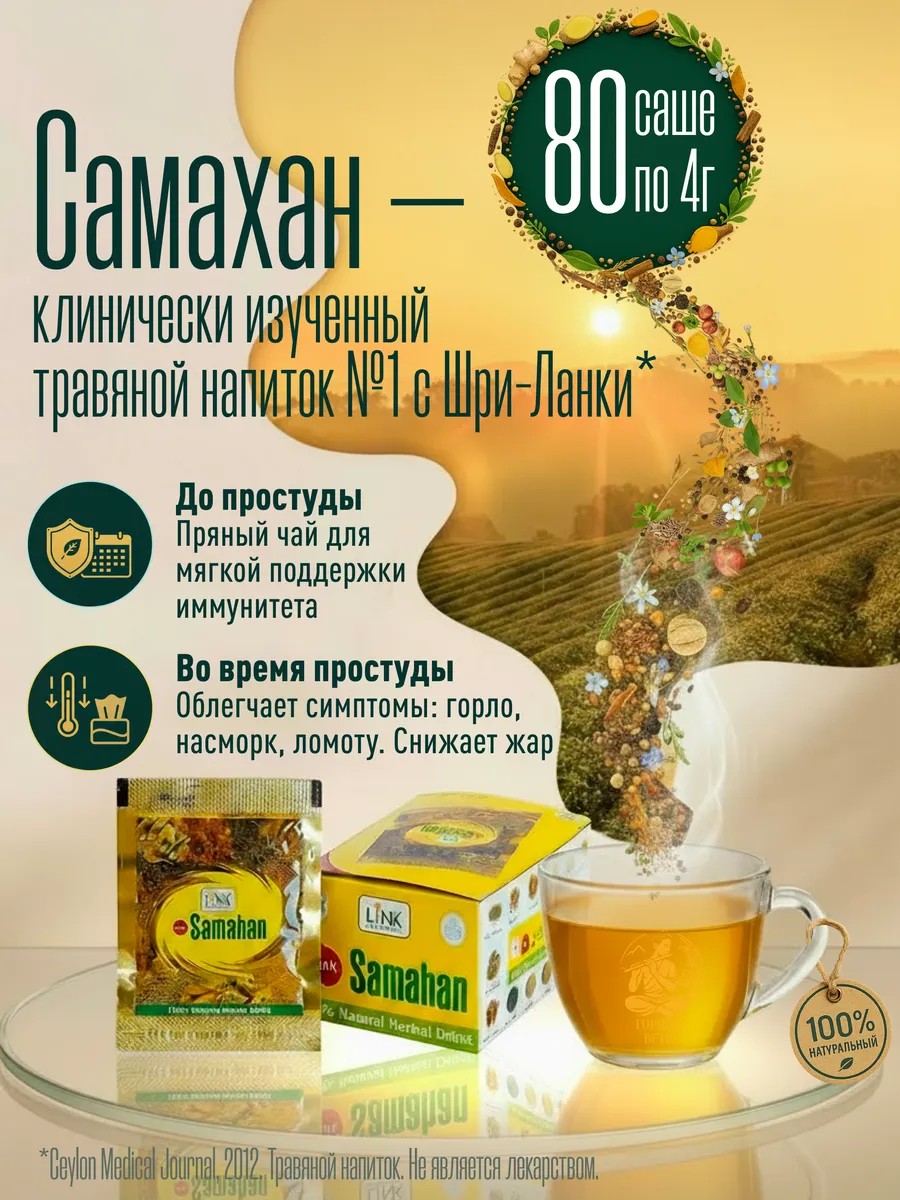 Cамахан – это уникальный травяной чай из Шри Ланки, созданный на основе древних аюрведических рецептов. Он содержит натуральные травы, включая имбирь, солодку, перец и специи, которые веками использовались в борьбе с симптомами простуды, кашля, гриппа и насморка. Этот пакетированный напиток не только отлично согревает в любой сезон, но и помогает организму справиться с переохлаждением. Напиток Линк Самахан (Link Samahan) незаменим при первых признаках простуды или гриппа, обладает согревающим и антисептическим эффектом, улучшает пищеварение и кровообращение, активизирует обмен веществ и укрепляет иммунитет. Он также подходит для очищения и мягкого детокс-эффекта, а также может стать поддержкой в период похудения.