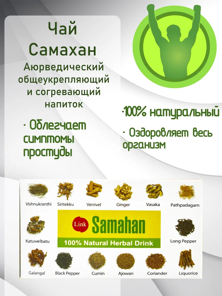 Samahan чай от Линк Шри Ланка - это вкусный и полезный напиток, который поможет вам справиться с простудой. Чудо-напиток имеет богатый состав, включающий 14 целебных трав: черный перец, кумин, имбирь, солодку и другие.