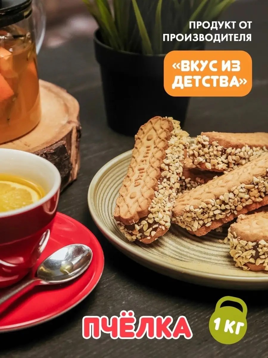 Печенье Пчелка имеет авторитет среди населения нашей страны! Состоит оно из двух половинок обычного рассыпчатого печенья, посередине начинено сгущенкой, а по бокам обсыпано орешками (обжаренный арахис).Песочное печенье с арахисом и вареной сгущенкой .Пчелка - это любимое лакомство из детства, которое так любят взрослые и дети. Сладасти имеет нежнейшую начинку из сгущенного молока и подарочный наборы. Посыпка вокруг печенья из ароматного арахиса придает сладостям особую изюминку. Рассыпчатое сдобное печенье буквально тает во рту и отличный подарок бабушке и подарок другу. Сладость с начинкой идеально подойдет к чаю, к кофе, к какао или горячему молоку. Сладости с вкусной начинкой и арахиса станет любимым десертом на вашем столе. Вкусняшки со сгущенкой составит достойную конкуренцию мягким венским вафлям с суфле, овсяным или протеиновым без сахара, с черным или молочным шоколадом, орехами, тягучей карамелью или глазурью, орешкам со сгущенкой, грибочкам. Любимая Пчёлка – это так хорошо знакомый вкус, который в одно мгновение вернет вас в детство и подарит хорошее настроение надолго. Наш продукт изготовленный по традиционной рецептуре, в сочетании с арахисом и сгущенкой высокого качества. Наша сладость станет любимым десертом на вашем столе. Выпечка, которая отлично подойдет для завтрака или чаепития в семейном кругу, не оставит равнодушным ни одного сладкоежку. Мы заботимся о здоровье своих клиентов, поэтому наше изготовление без ГМО, искусственных добавок и консервантов. Наши продукты - идеальная еда для домашнего чаепития и подарочной набор. Сахарное сдобное печенье станет отличным вкусным подарком для ребенка, коллеги, любимой девушки. Свежее, мягкое и в меру сладкое с большим количеством вишневой начинки пирожное тает во рту. С таким сладким презентом можно прийти на новоселье, на день рождение и сделать приятное маме или просто поднять себе настроение. Отличный вариант для детского перекуса в школу как для малышей, так и для подростков. Натуральные сладости - лучший перекус и отличный способ поднять себе настроение.