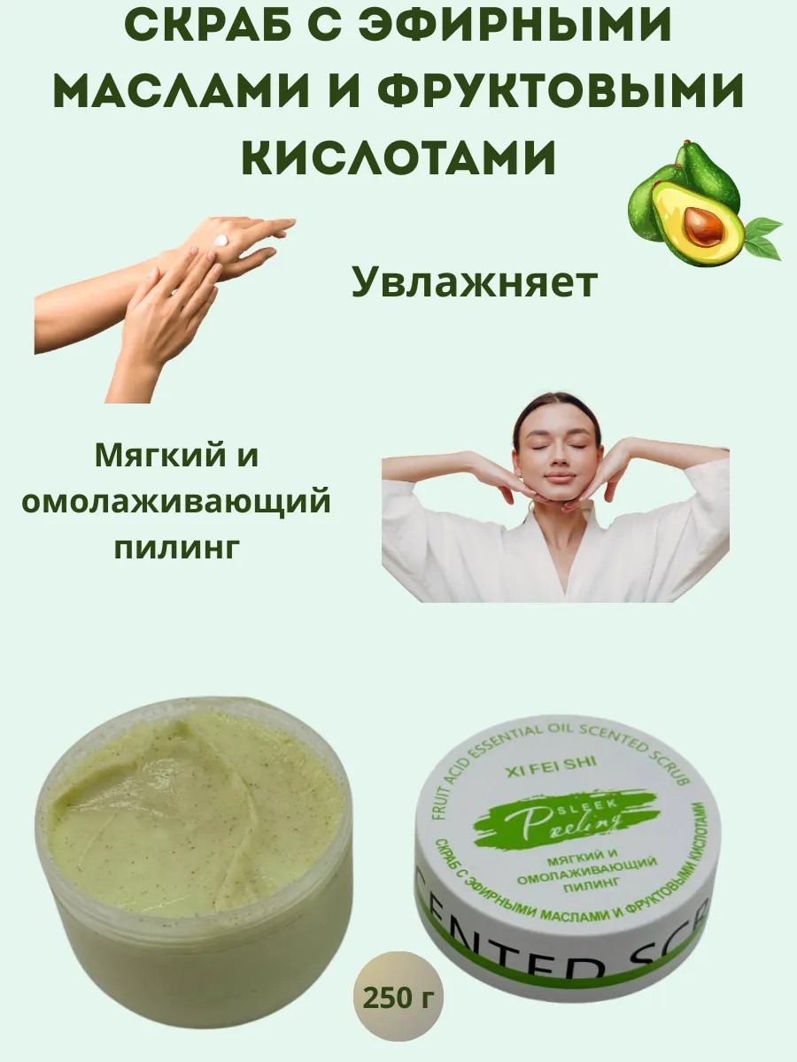 Это мягкий и омолаживающий пилинг-скраб для лица и тела с эфирными маслами и фруктовыми кислотами. Пилинг и отшелушивание: Скраб предназначен для удаления омертвевших клеток кожи, способствуя ее обновлению и улучшению текстуры.