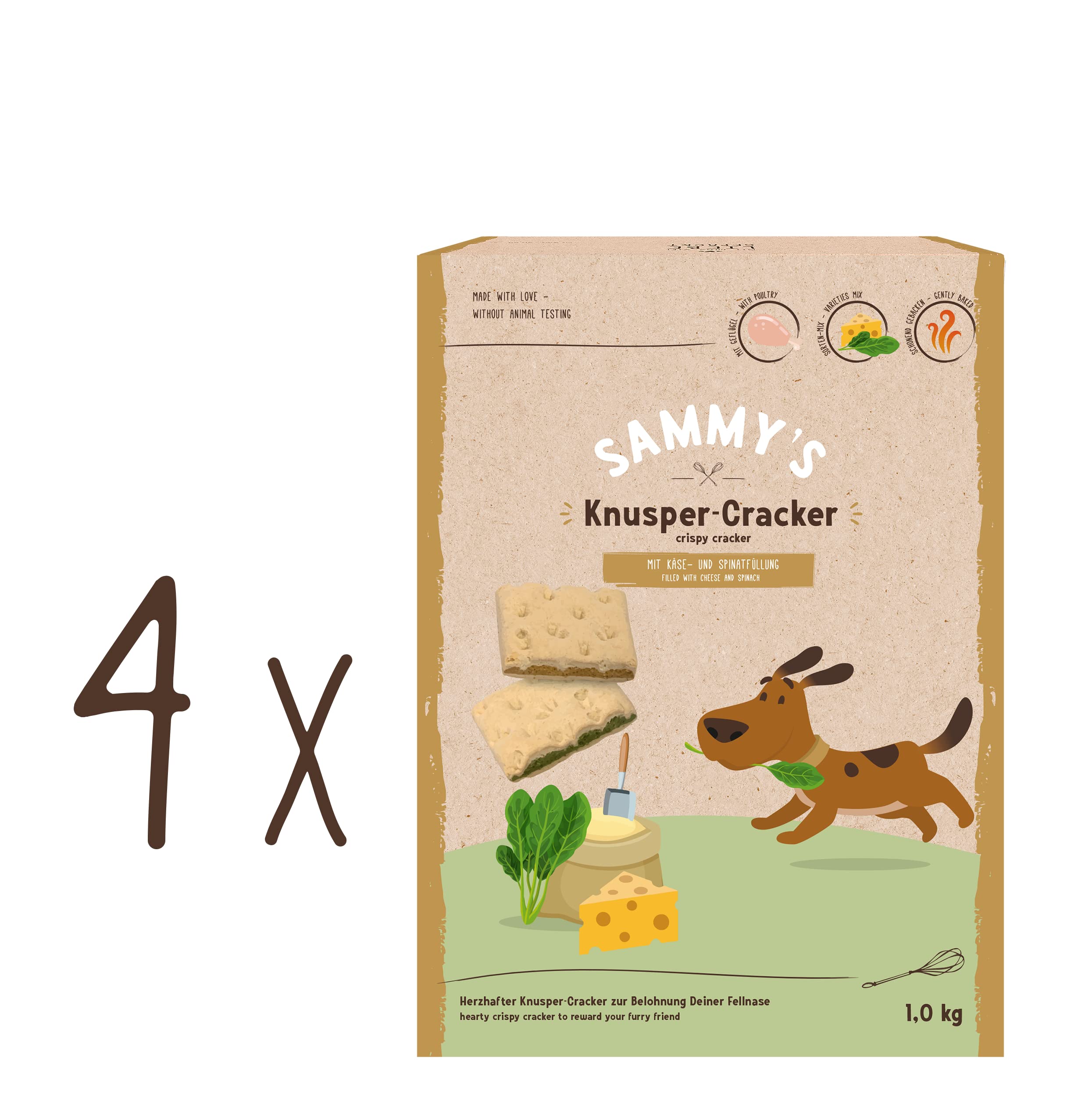 Sammy's Cnusper Cracker 4 x 1 kg . Cheese and spinach filling: a crunch to reward your nose Sammys fresh and crispy pastries. Only with raw materials of known origin and quality No sugar, chemical colors or flavors For adult dogs from 12 months Made with lots of love in Baden-WürttembergMade with love in Baden-Württemberg. For adult dogs from 12 months old. No sugar, chemical colors, or flavorings. Fresh and crispy Sammys pastries. Made exclusively with raw materials of known origin and quality. Filled with cheese and spinach: a crunchy treat to reward your nose. Sammy 's Cnusper Cracker 4 x 1 kg .Remplissage de fromage et d'épinards : un croustillant pour récompenser votre nez Des pâtisseries fraîches et croustillantes Sammys. Uniquement avec des matières premières d'origine et qualité connues Sans sucre ni colorants chimiques ni arômes Pour chiens adultes à partir de 12 mois Fabriqué avec beaucoup d'amour à Bade-WurtembergFabriqué avec beaucoup d'amour à Bade-Wurtemberg. Pour chiens adultes à partir de 12 mois. Sans sucre ni colorants chimiques ni arômes. Des pâtisseries fraîches et croustillantes Sammys. Uniquement avec des matières premières d'origine et qualité connues. Remplissage de fromage et d'épinards : un croustillant pour récompenser votre nez.