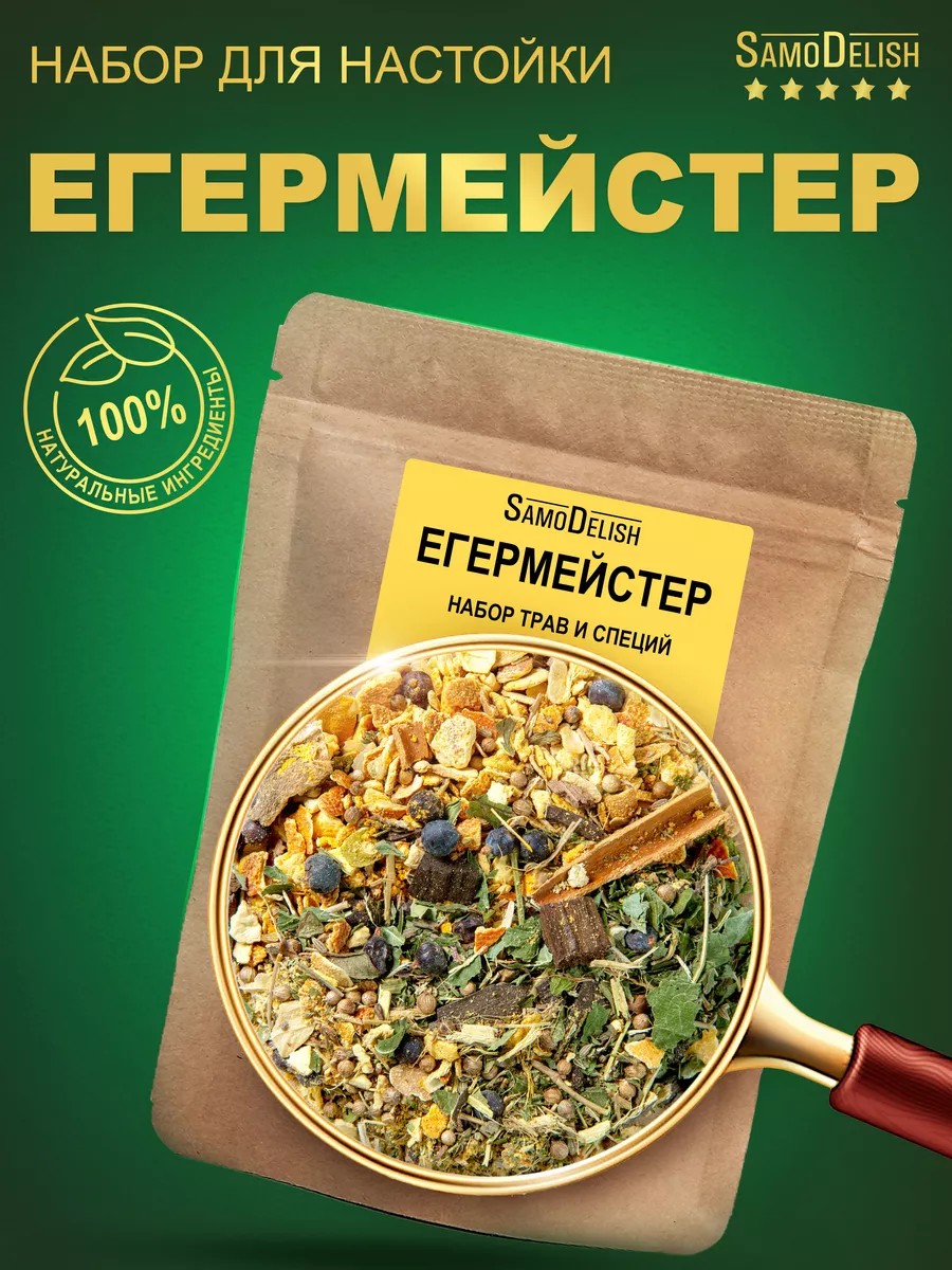 Настойка ЕГЕРМЕЙСТЕР 35 гр - это набор трав и специй для приготовления в домашних условиях напитка со вкусом одноименного знаменитого немецкого ликёра. В состав набора входят следующие ингредиенты: женьшень, корень горечавки, корень ревеня, кора сандалового дерева, кориандр, можжевельник, лист черники, лист смородины, имбирь, корица, цедра апельсина, цедра лимона, мята, лакрица, анис, дубовая щепа.Используя набор для настойки ЕГЕРМЕЙСТЕР, вы получите оригинальный напиток тёмно-бурого цвета с мягкой текстурой и богатым на пряные ноты ароматом. Вкус напитка многокомпонентный сладковато-горький с ярким оттенком лакрицы и голубого можжевельника.Рекомендуемый способ приготовления: содержимое упаковки залить 1 литром самогона или водки 40% крепости. Добавить 1 столовую ложку карамельного сахара. Настаивать 10-14 дней, периодически встряхивая настой. После настаивания отфильтровать (процедить) и перелить в удобную ёмкость. ОБЯЗАТЕЛЬНО дать напитку отдохнуть 7-10 дней, после можно дегустировать.