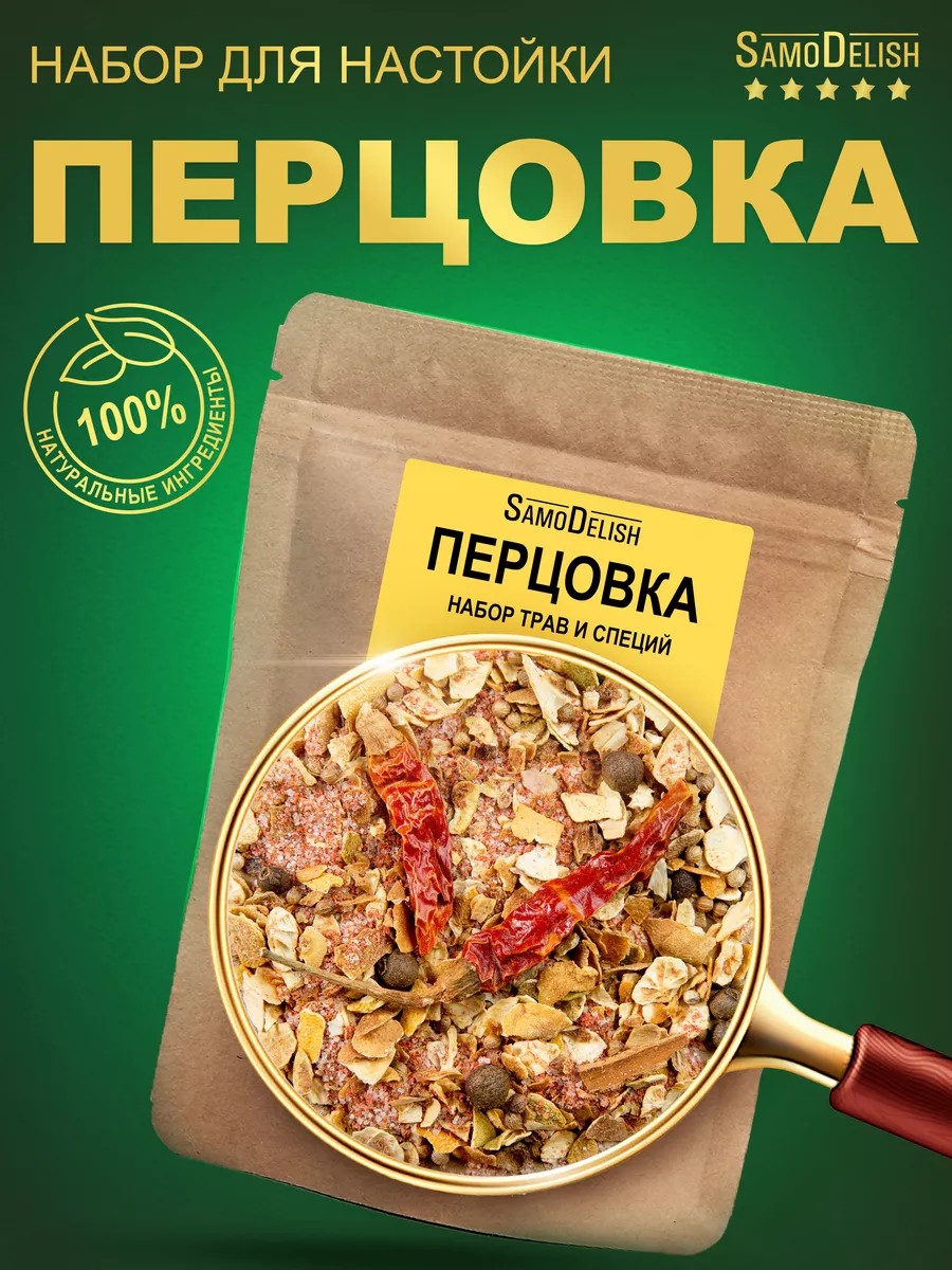 Настойка ПЕРЦОВКА 25 гр - это набор трав и специй для приготовления домашней перцовой настойки. В состав набора входят следующие ингредиенты: перец душистый, перец чили молотый, перец чили стручковый, мускатный орех, кориандр, цедра лимона, корица, ванильный сахар.Используя набор для настойки ПЕРЦОВКА, вы получите напиток янтарного цвета, с крепким, пикантным, обжигающим вкусом, который гармонично дополнен оттенками пряностей и медовой сладостью. Послевкусие долгое, согревающее, с цитрусовой свежестью. Настойка имеет оздоравливающий эффект, способствует укреплению иммунитета (при употреблении в небольших количествах) и помогает бороться с вирусными инфекциями.Рекомендуемый способ приготовления: содержимое упаковки залить 2 литрами самогона или водки 40% крепости. Добавить 1 столовую ложку меда. Настаивать 10-14 дней, периодически встряхивая настой. После настаивания отфильтровать (процедить) и перелить в удобную ёмкость. ОБЯЗАТЕЛЬНО дать напитку отдохнуть 7-10 дней, после можно дегустировать.