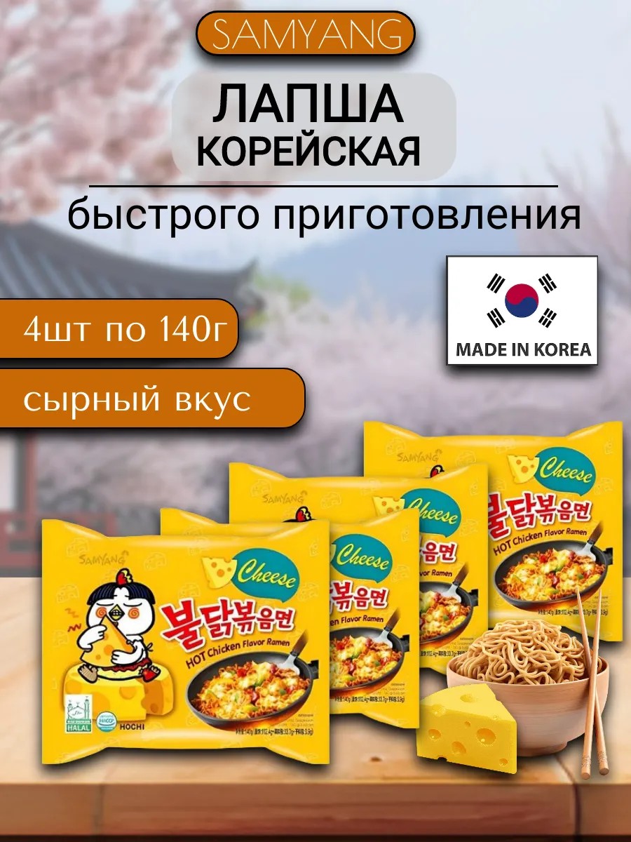 Korean instant noodles "Hot Chicken Flavor Ramen Cheese" with spicy chicken and cheese flavor is a traditional Korean dish made with a special type of noodle, cooks quickly, and satisfies hunger. These noodles have a unique texture and a distinctive flavor that distinguishes them from other types of noodles. Korean noodles are a popular product in Asia and beyond due to their taste and ease of preparation.