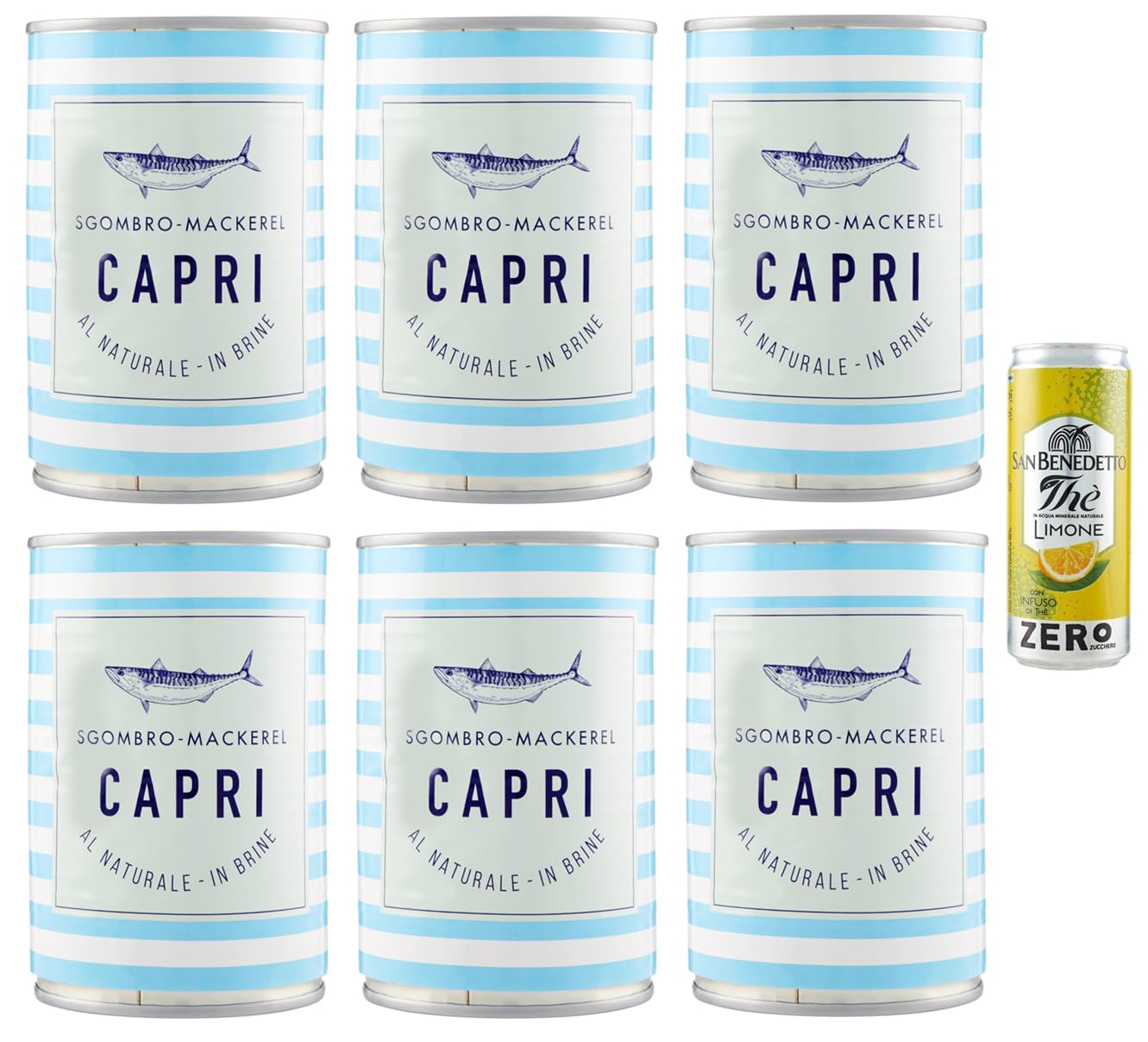 Capri Sgombro al Naturale - Maquereau naturel - Boîte de 425 g 1 sachet de thé glacé San Benedetto au citron - Sans sucre - Boîte de 330 ml