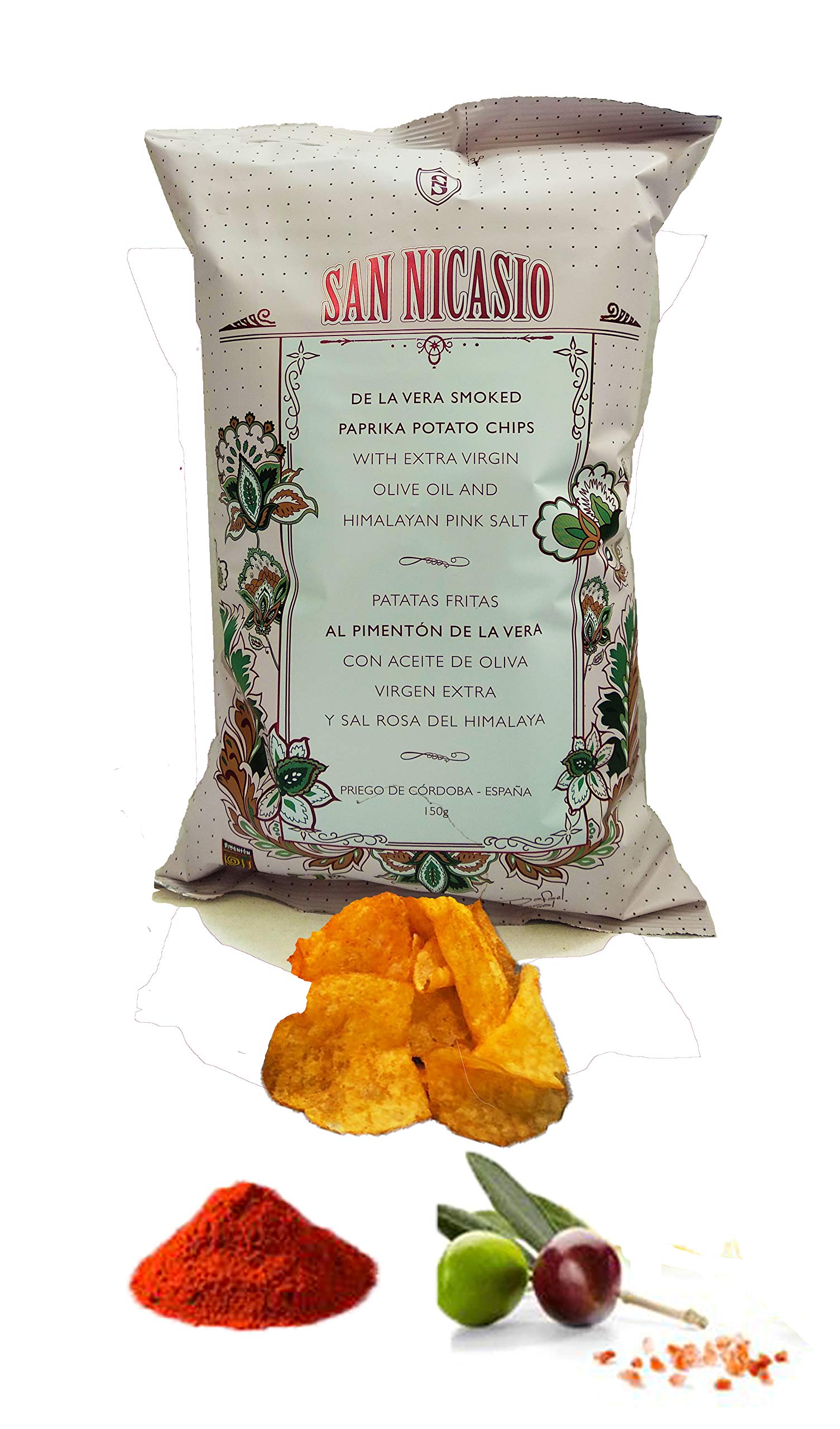 Potato chips with peppers from La Vera with DO, fried with 100 extra virgin olive oil at low temperature and Himalayan pink salt, packed in a protective atmosphere for preferential consumption of 10 months.SAN NICASIO frites met Pimentn de la Vera DOP doos van 14 zakken van 150gr Aardappelchips met paprika van La Vera met DO, gebakken met 100 extra vierge olijfolie bij lage temperatuur en Himalaya-roze zout, verpakt in een beschermende atmosfeer voor een preferentiële consumptie van 10 maanden.