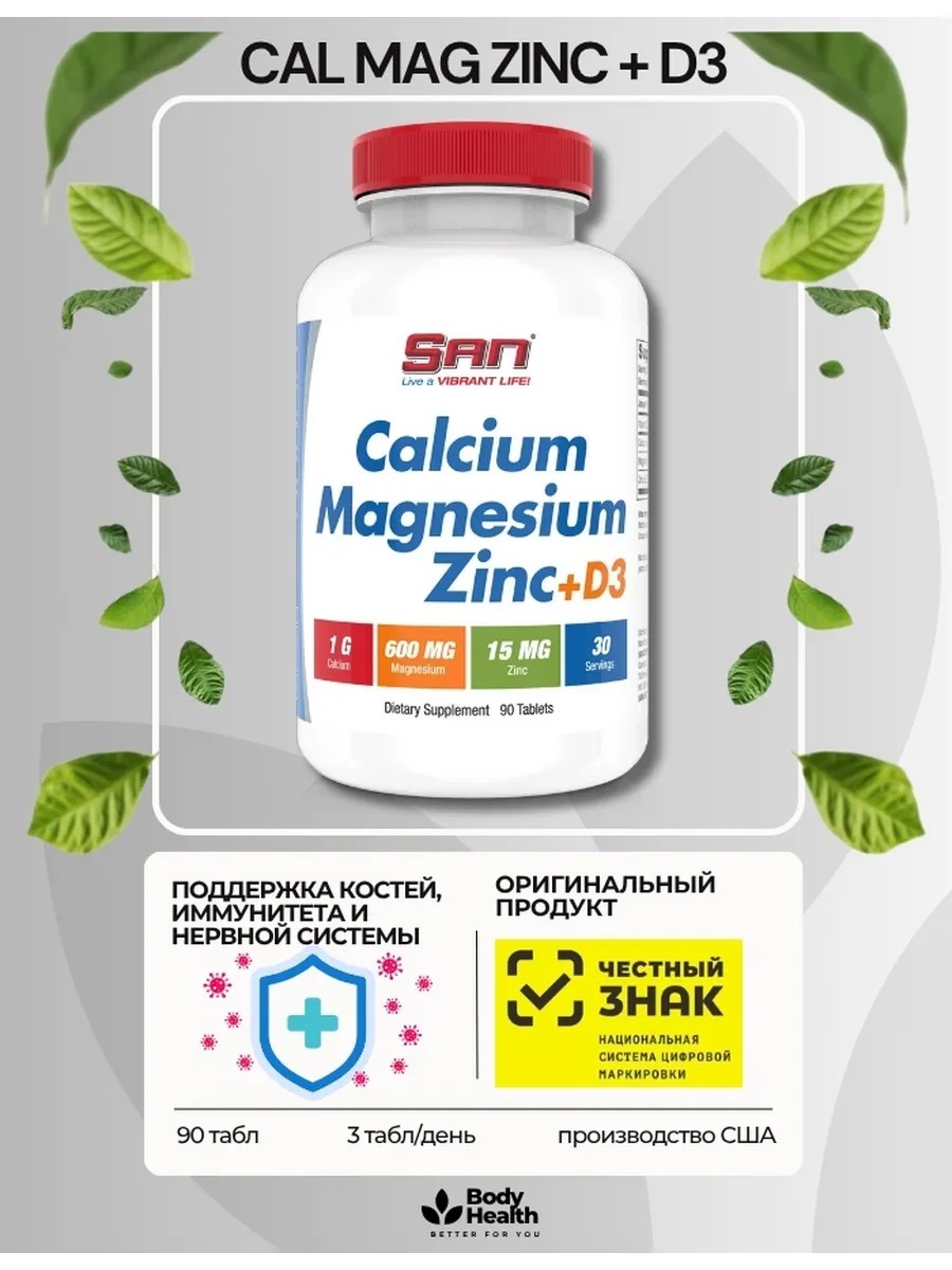 Комплекс SAN Calcium Magnesium Zinc + D3 обеспечивает организм микроэлементами, которые необходимы ему каждый день. Его формула включает кальций, магний, цинк и витамин Д3, которые играют важную роль в работе многих систем нашего организма. При их участии укрепляется структура костей и зубов, они нужны для эффективной иммунной функции, для надлежащей деятельности нервной системы, для энергетической поддержки организма, а также для продуктивного его восстановления после физических нагрузок.