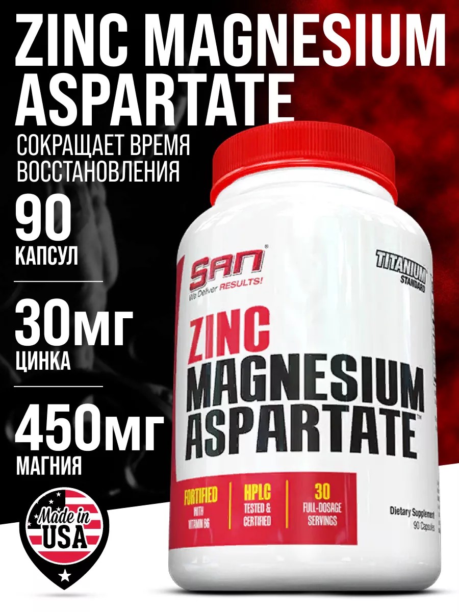 SAN Zinc Magnesium Aspartate (90 капс) - оригинальная американская добавка Аспартат Магния и Цинка ZMA, которая является комбинацией витаминов и минералов с доказанным повышением производительности, репарации тканей и продукции гормонов. Способность к быстрому восстановлению после высокозатратных физических нагрузок с помощью ЦМА, позволяет повышать силовые возможности организма. Комплекс Zinc Magnesium Aspartate от SAN представляет собой смесь цинка, магния и витамина Б6, которые помогут вам сократить время восстановления организма после тяжелой физической активности, а также увеличить уровень тестостерона в теле. И все это происходит во время сна в комбинации с естественным восстановлением вашего тела, которое запускается в ночной период. Zinc Magnesium Aspartate высочайшего качества от американского производителя SAN для Ваших лучших результатов!