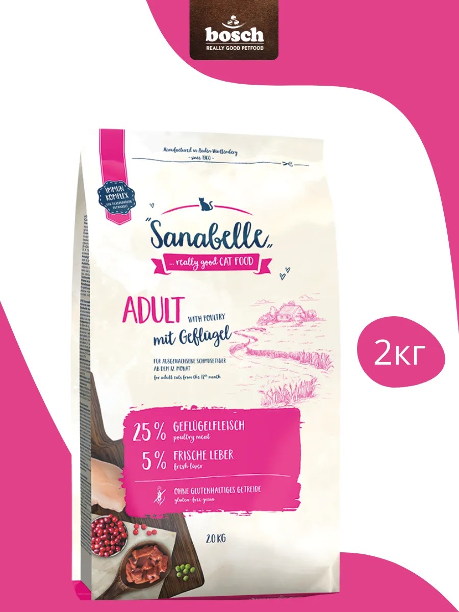 Корм для кошек супер премиум класса Bosch Sanabelle Adult изготовлен на основе свежего мяса домашней птицы для взрослых кошек всех пород мелких, средних и крупных пород с чувствительным пищеварением. Корм и лакомства для кошек насыщенный питательными веществами и минералами. Гипоаллергенный корм для кошек благодаря своему составу позволяем котам и кошкам получать все необходимые полезные элементы, которые способствуют нормализации пищеварения, не вызывают аллергию и пищевую непереносимость. Сухой корм для стерилизованных кошек и кастрированных котов разработан немецкими экспертами завода Bosh с учетом потребностей животных после стерилизации, поддерживает здоровый обмен веществ и оптимальный вес питомца. Корм для кошек 2 кг кг изготовлен без добавления красителей, искусственных ароматизаторов и консервантов. Для развития головного мозга и органов зрения кошачий корм содержит омега-3 жирных кислот. Лакомства для кошек изготовлены с использованием экстракта зелено губчатого моллюска, который благотворно влияет на развитие и формирование хрящей и суставов животного. Сухой корм для кошек 2 кг подходит для питомца в возрасте от 1 года и для пожилых кошек, которые требуют помощи в поддержание рациона, который позволит обеспечить полноценное поступление необходимых элементов. Пищевые добавки и витамины входящие в корм Санабель для кошек: витамин А 17000 МЕ, витамин D3 1500 МЕ, витамин В1 20 мг, витамин В2 18 мг, витамин В6 20 мг, витамин В12 40 мкг, биотин 275 мкг, пантотеновая кислота 20 мг, ниацин 80 мг, таурин 2000 мг, фолиевая кислота 2,0 мг, хлорид холина 2450 мг, витамин Е 150 мг. royal canin, pro plan, purina one, probalance, perfect fit, перфект фит, роял канин, санабнль, bosh, корм бош. Корм для котов насыщен микроэлементами: цинк (в виде аминокислоты хелата цинка, гидрата) 40 мг, меди (в виде сульфата меди, пентагидрата) 10 мг, йода (в виде йодида кальция, безводного) 2 мг, селена (в виде селенита натрия) 0,2 мг, цинка. (в виде оксида цинка) 30 мг.