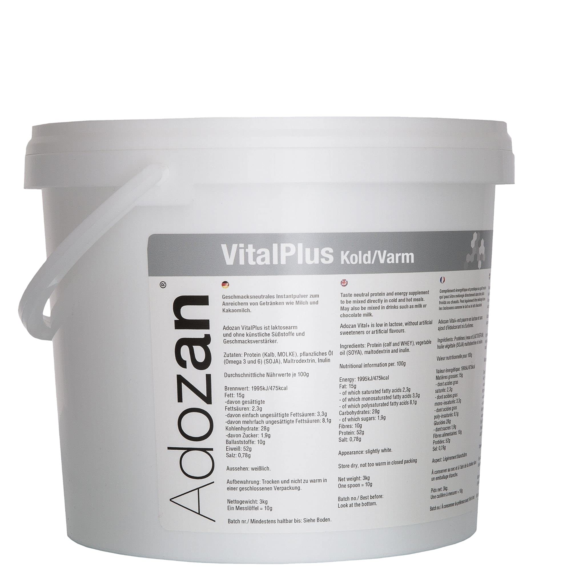Suitable for: Adozan Vital Plus is suitable for increased energy and protein needs, e.g. lack of appetite, lack of appetite, swallowing problems (dysphagia), eating disorders, problems with chewing or swallowing, malnutrition or after illnesses. Is also suitable for oncology, cancer, surgery, wound healing disorders. sarcopenia, Oncology, geriatrics, elderly care, loss of appetite, underweight. Easy to use: Adozan Vital Plus is a tasteless instant powder that has been developed with a high focus on easy use and good tolerability. It is simply stirred into the daily diet and is quickly soluble and lump-free. All important amino acids: Adozan Vital Plus protein powder contains all important amino acids, including the branched chain amino acids (BCAAs) leucine, isoleucine and valine. Proteins contribute to the maintenance of healthy bones. Proteins contribute to the maintenance and building of muscle mass. Very high protein content: Adozan Vital Plus instant powder contains 52 g protein per 100 g (5.2 g per serving), 15 g fat and 28 g carbohydrates. Rich in omega-3 and 6 fatty acids: Adozan Vital Plus is rich in essential omega 3 and 6 fatty acids. Bulk source: Adozan Vital Plus contains 3 g fiber per 100 g. Free from: artificial additives or flavor enhancers. Adozan Vital Plus carbohydrate and protein powder, 3000 g, tasteless instant powder with fiber from SanaCare Nutrition ApS.Adozan Vital Plus Energie- en eiwitpoeder, smaakneutraal, koolhydraatrijk eiwitpoeder, zeer goed voor warme en koude gerechten en dranken, dieetbeheer, 3000 g neutraal 3 kg (1er Pack)Geschikt voor: Adozan Vital Plus is geschikt voor een verhoogde energie- en eiwitbehoefte bijv. bij gebrek aan eetlust (snaptie), gebrek aan eetlust, slikproblemen (dysfagie), eetstoornissen, problemen bij kauwen of slikken, ondervoeding of na ziekten. Is ook geschikt voor oncologie, kanker, chirurgie, wondgenezingsstoornissen. sarcopenie, Oncologie, geriatrie, ouderenzorg, verlies van eetlust, ondergewicht. Eenvoudig in gebruik: Adozan Vital Plus is een smaakneutraal instantpoeder, dat met een hoge focus is ontwikkeld op eenvoudig gebruik en goede verdraagzaamheid. Het wordt eenvoudig in de dagelijkse voeding geroerd en is snel oplosbaar en klontervrij. Alle belangrijke aminozuren: Adozan Vital Plus-eiwitpoeder bevat alle belangrijke aminozuren onder andere de vertakte keten aminozuren (BCAA's) leucine, isoleucine en valine. Eiwitten dragen bij aan het behoud van gezonde botten. Eiwitten dragen bij aan het behoud en de opbouw van spiermassa. Zeer hoog eiwitgehalte: Adozan Vital Plus-instantpoeder bevat 52 g eiwit per 100 g (5,2 g per portie), 15 g vet en 28 g koolhydraten. Rijk aan omega-3 en 6 vetzuren: Adozan Vital Plus is rijk aan essentiële omega 3 en 6 vetzuren. Ballastbron: Adozan Vital Plus bevat 3 g vezels per 100 g. Vrij van: kunstmatige additieven of smaakversterkers. Adozan Vital Plus koolhydraat- en eiwitpoeder, 3000 g, smaakneutraal instantpoeder met vezels van SanaCare Nutrition ApS.