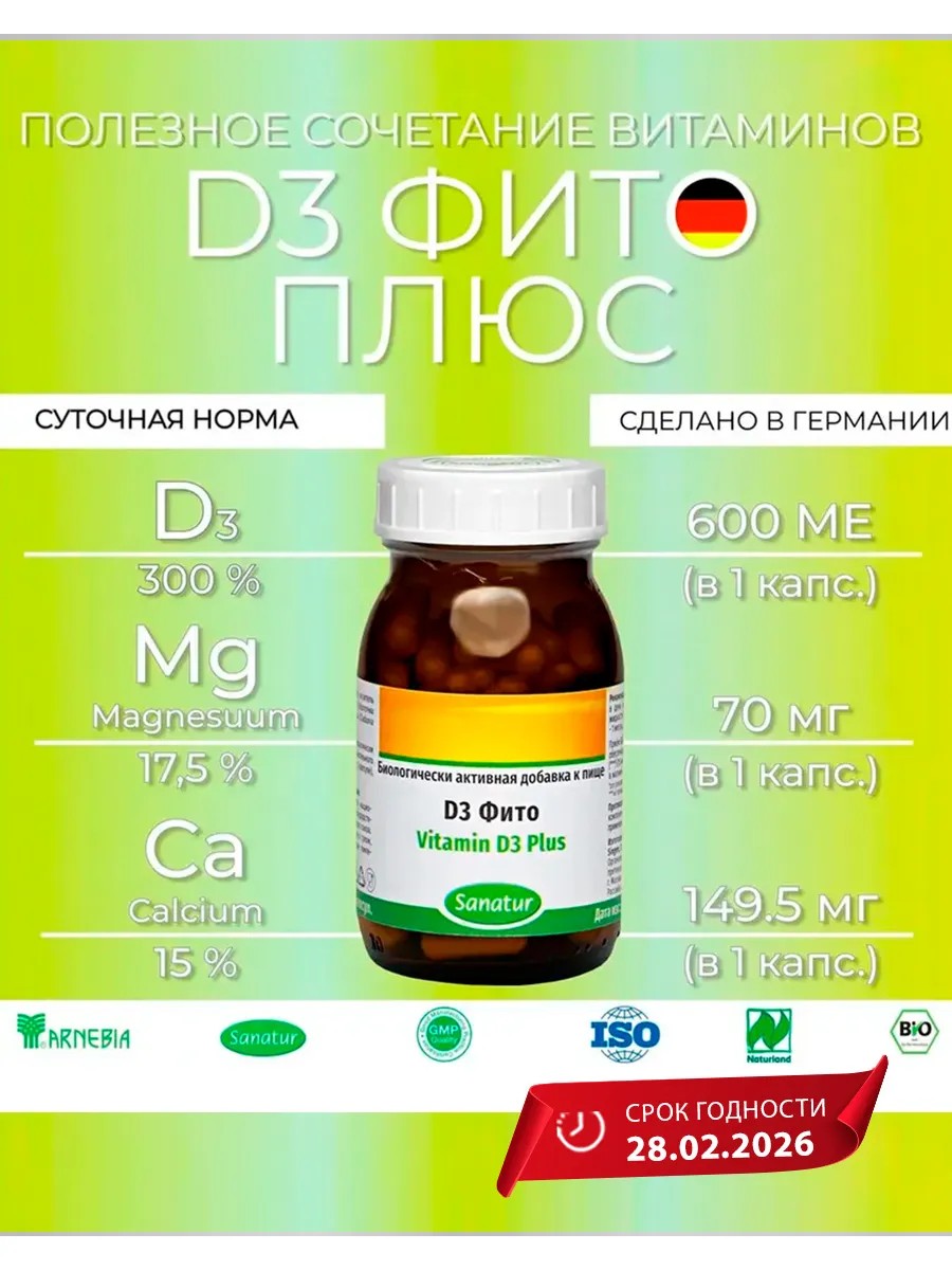 | Полное наименование товара | Санатур Sanatur D3 Фито, 90 капсул по 770 мг |