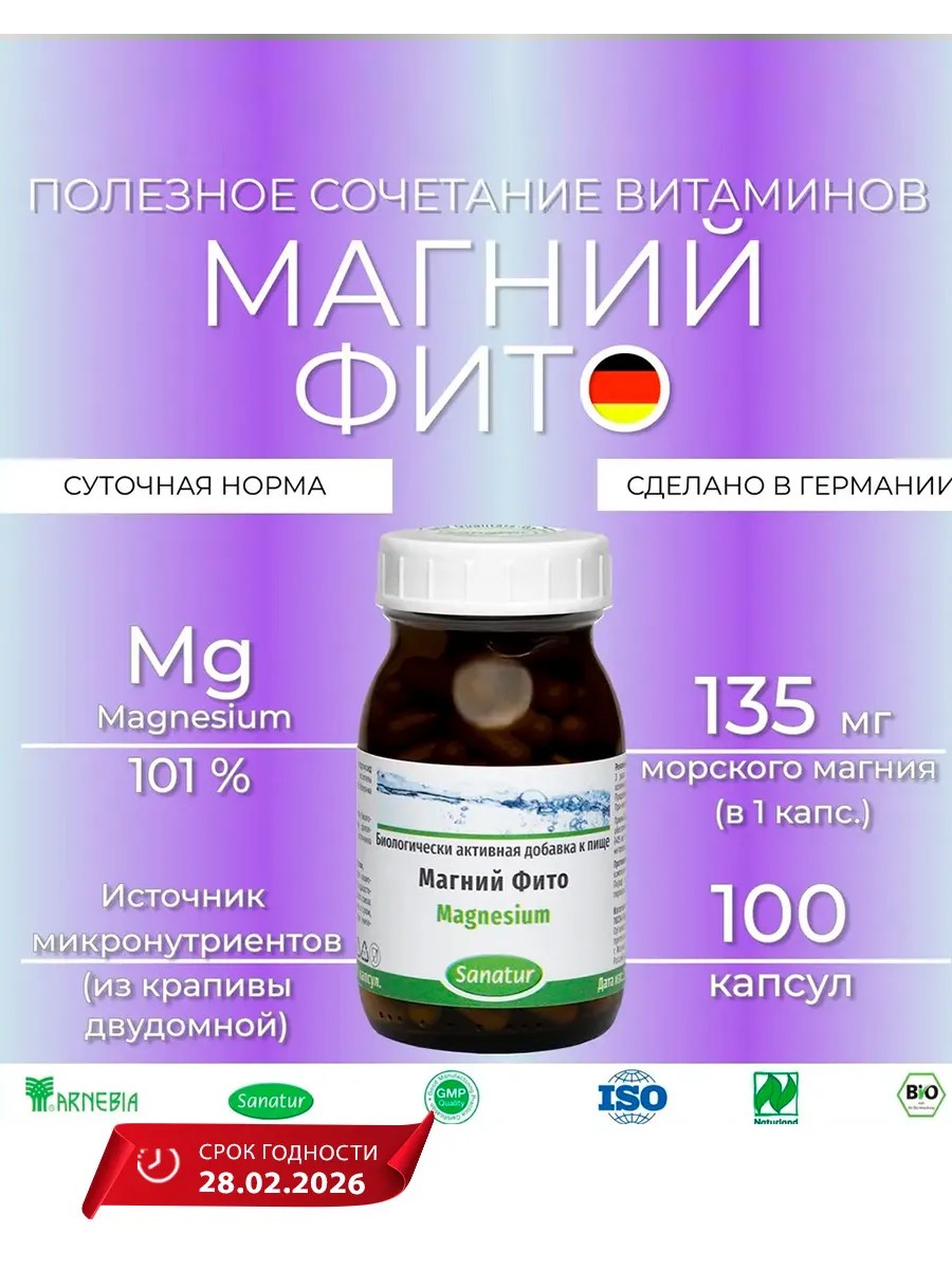 The dietary supplement MAGNESIUM PHYTO is an additional source of magnesium and flavonoids to support heart and nervous system function, reduce stress and fatigue, strengthen bones, teeth, and muscles, and is an antioxidant that maintains electrolyte balance and optimizes energy metabolism. Bioavailable marine magnesium, supplemented with nettle powder, is a valuable source of plant magnesium and other beneficial elements. Recommended for men and women who lead active lifestyles and experience high physical, mental, and emotional stress, athletes, students, the elderly, and the elderly to strengthen the cardiovascular system and reduce stress. The recommended adult dose (3 capsules per day) contains 405 mg of magnesium. Magnesium is a key macronutrient for energy metabolism reactions involving ATP, for normal heart and nervous system function, and for bone formation. Promotes optimal myocardial function, relieves chronic muscle tension, and normalizes rest and sleep. Most magnesium is found in cells, where it activates enzymes necessary for carbohydrate and amino acid metabolism. It can improve vision in patients with glaucoma, helps normalize low blood pressure, and may be a factor in chronic fatigue syndrome. This element is also important for maintaining female and male beauty, health, and youth, as a deficiency can lead to hair loss and brittle nails. Research has shown that magnesium can be beneficial in preventing cardiovascular disease and osteoporosis, and can also lower cholesterol levels. Magnesium deficiency affects the transmission of nerve and muscle impulses, manifesting as nervousness and irritability. A magnesium deficiency disrupts protein biosynthesis, causing involuntary muscle contractions, sometimes cramps, and loss of appetite. Stinging nettle (Urtica dioica) contains chlorophyll, valuable organic acids, glycosides and tannins, silicon, iron, magnesium, carotenoids, vitamin K, vitamin C (ascorbic acid), and acetylcholine. Nettle is included in vitamin (general tonic) infusions. Features of Sanatur Magnesium Phyto - made from magnesium sea salt (magnesium hydroxide), natural nettle powder supplements the magnesium content, high absorption rate, capsule contents without additives. Vegan. Natural. Gluten-free. Lactose-free. Iodine-free. Vegetable capsule shell. Each product shipment undergoes independent testing in Germany for pesticides, heavy metals, and microbiology. Biologically active food supplement (not a medicine). Keep out of reach of children, store in a dry place protected from sunlight. Supplied directly in Germany. INGREDIENTS: magnesium sea salt (magnesium hydroxide), nettle powder, hydroxypropyl methylcellulose carrier (capsule shell).
