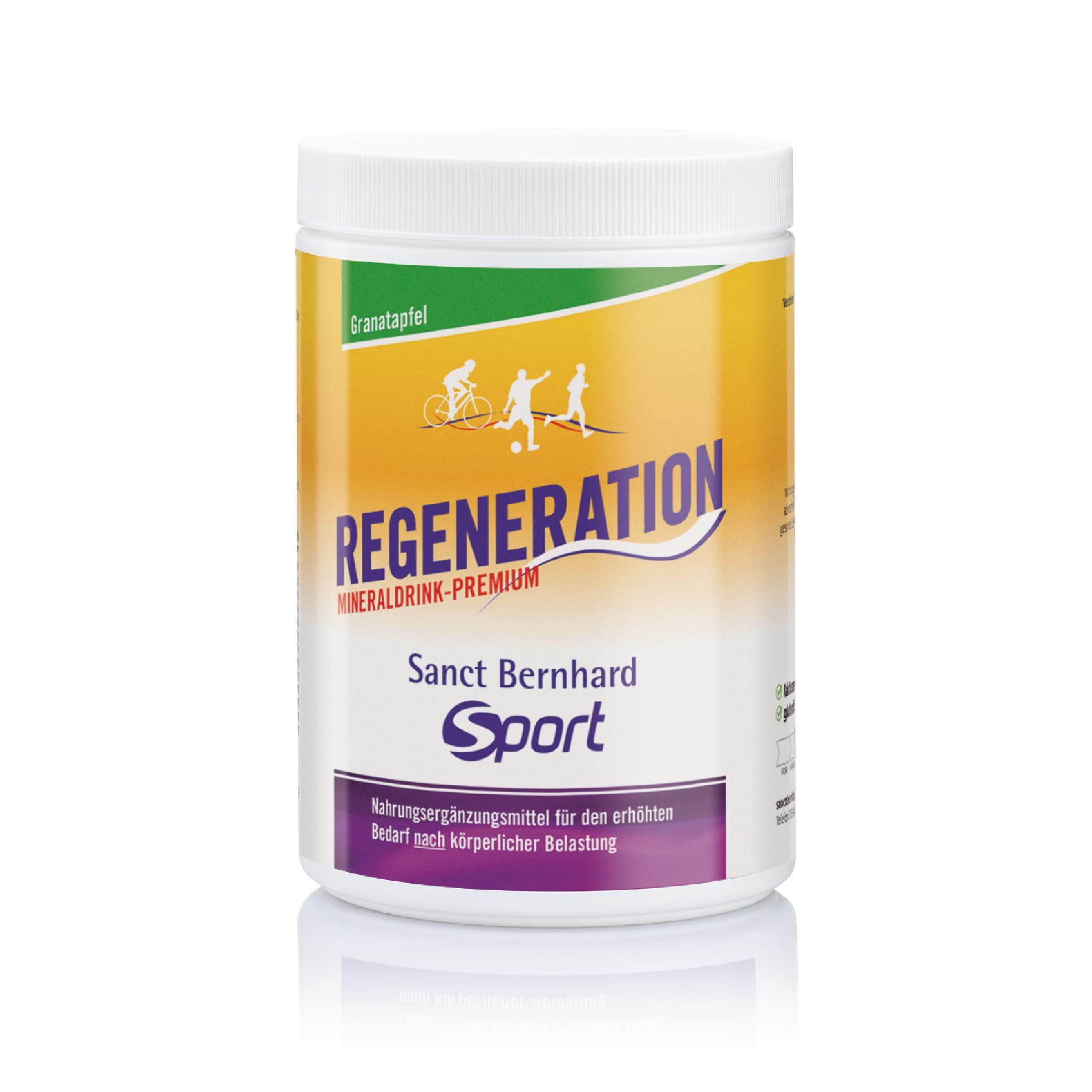 After moderate exertion, energy and electrolyte reserves are depleted after physical activity. To ensure effective replenishment, this drink contains a balanced combination of carbohydrates and readily available minerals. It also includes B vitamins, which support efficient energy metabolism. Magnesium, along with vitamins B2, B6, and niacin, quickly reduce fatigue after exercise, while potassium supports normal muscle function. This replenishing drink is perfectly suited to our isotonic energy drink. Very well tolerated, especially by those with fructose intolerance. Lactose-free and gluten-free. Flavor: Pomegranate. Contents: 750g yields approximately 18.25 liters of ready-to-drink beverage. INGREDIENTS Ingredients: Maltodextrin, sucrose, citric acid, potassium citrate, trimagnesium citrate, flavoring, niacin, vitamin B6 hydrochloride, vitamin B1 mononitrate, vitamin B2. INSTRUCTIONS FOR USE Recommended use: Dissolve in water according to the following formula: 1 1 4 scoops (approximately 20 g) (inside) make 500 ml. To avoid lumps, pour the water first, then the powder. Drink 500 ml immediately after exercise (e.g., competition, etc.) to replenish fluids and carbohydrates. Note for diabetics: 500 ml (approximately 20 g of powder) provides 1.3 BE (basic energy intake). See moreContents: 750 g. This replenishing drink is perfectly suited to our isotonic energy drink. Very well tolerated. Balanced combination of carbohydrates and usable minerals. Replenishing drink for effective energy and electrolyte replenishment.Sanct Bernhard Sport Regeneration Premium Boisson minérale 750 g en poudre pour 18,75 lDESCRIPTION DU PRODUIT DESCRIPTION DU PRODUIT Après une charge modérée. Les réserves d'énergie et d'électrolytes sont épuisées après l'activité physique. Afin de garantir un reconstitution efficace des mémoires, cette boisson contient une combinaison équilibrée de glucides et de minéraux utilisables. En outre, les vitamines B sont incluses qui assurent un métabolisme énergétique efficace. Le magnésium ainsi que les vitamines B2, B6 et la niacine réduisent rapidement la fatigue après l'effort, tandis que le potassium soutient une fonction musculaire normale. Cette boisson régénérante est parfaitement adaptée à notre boisson énergétique isotone. Très bien toléré. Principalement également en cas d'intolérance au fructose. Sans lactose et sans gluten. Goût : grenade contenu 750 g donne environ 18,25 litres de boisson prête à l'emploi. INGRÉDIENTS Ingrédients : maltodextrine, saccharose, acidifiant acide citrique, citrate de potassium, citrate de trimagnésium, arôme, niacine, chlorhydrate de vitamine B6, mononitrate de vitamine B1, vitamine B2. MODE D'EMPLOI Recommandation d'utilisation : veuillez dissoudre dans l'eau selon le schéma suivant : 1¼ (environ 20 g) cuillères doseuses (à l'intérieur) font 500 ml. Pour éviter les grumeaux, versez d'abord l'eau puis la poudre. Boire 500 ml immédiatement après la phase d'effort (par exemple compétition, etc.) pour reconstituer les liquides et les glucides. Remarque pour les diabétiques : 500 ml (environ 20 g de poudre) La boisson correspond à 1,3 BE. Voir plusContenu : 750 g. Cette boisson régénérante est parfaitement adaptée à notre boisson énergétique isotonique. Très bien toléré. Combinaison équilibrée de glucides et de minéraux utilisables. Boisson régénérante pour un remplissage efficace des réserves d'énergie et d'électrolytes.